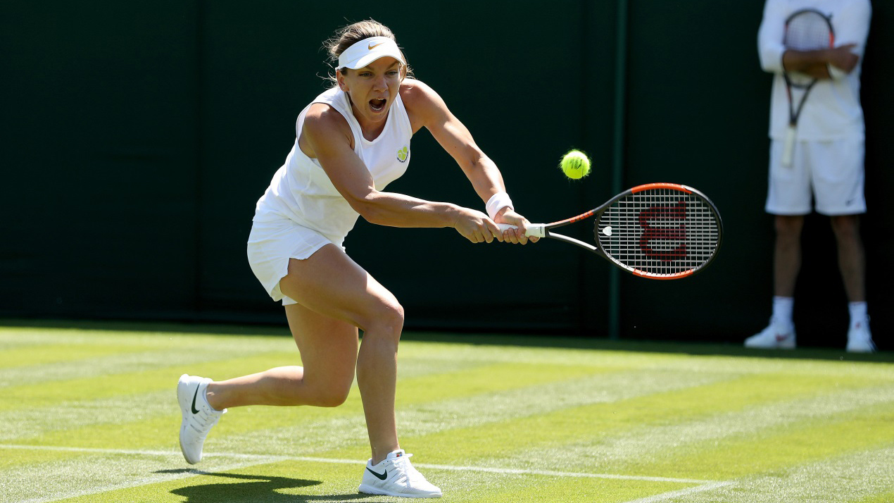 Simona Halep of Romania practices on court during training for the Wimbledon Lawn Tennis Championships at the All England Lawn Tennis and Croquet Club. /VCG Photo