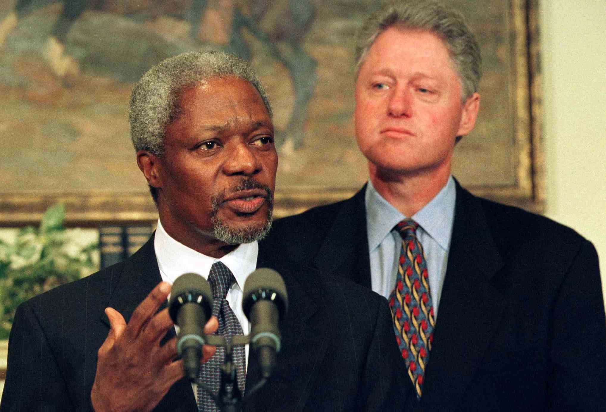Then UN Secretary-General Kofi Annan (L) speaks at the White House after meeting then US President Bill Clinton at White House, January 23, 1997. /VCG Photo