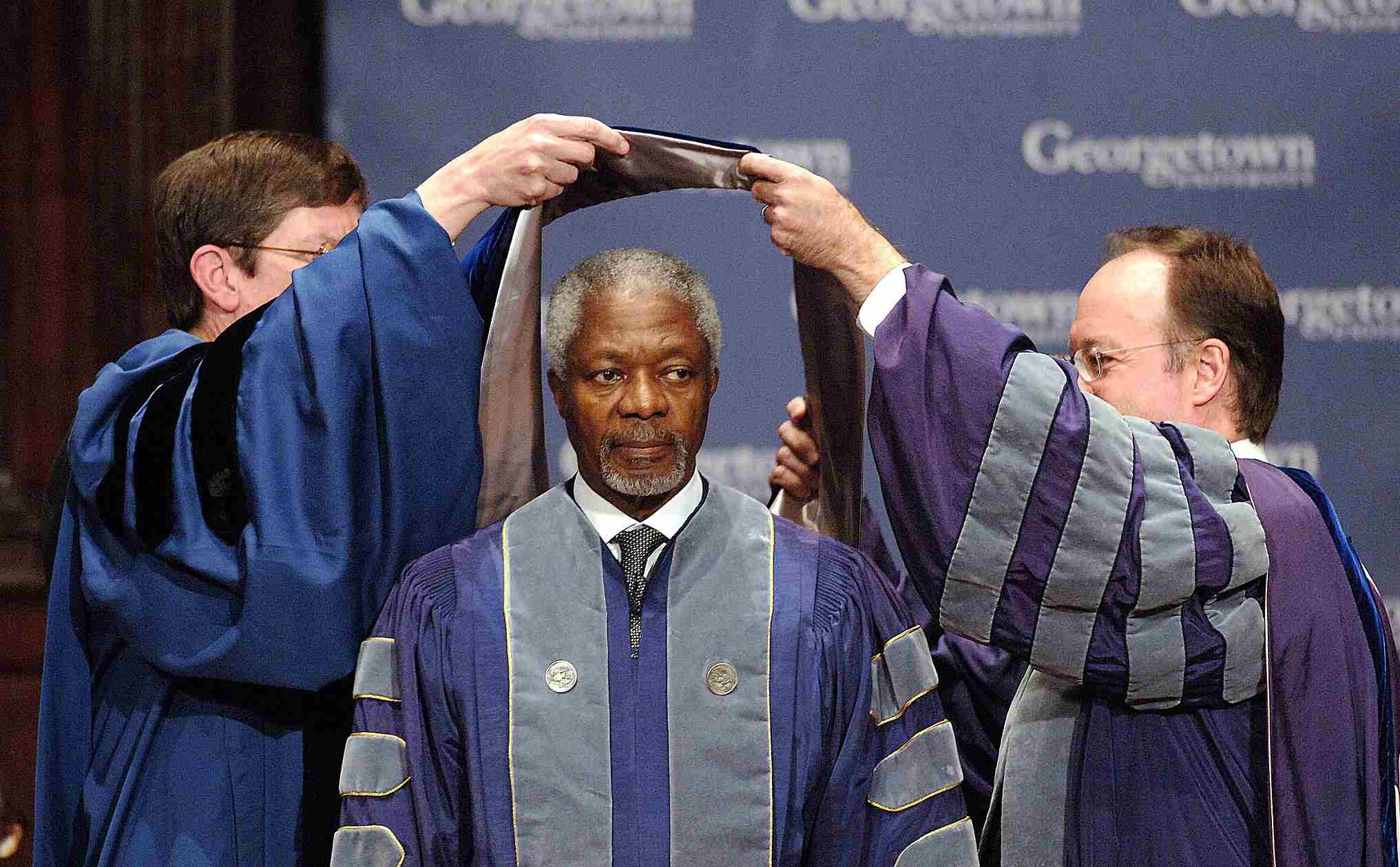 Then UN Secretary-General Kofi Annan (C) receives a sash as he is conferred the Doctor of Humane Letters degree from Georgetown University Provost James O'Donnell (L) and University President John DeGioia (R) in the US, October 31, 2006. /VCG Photo