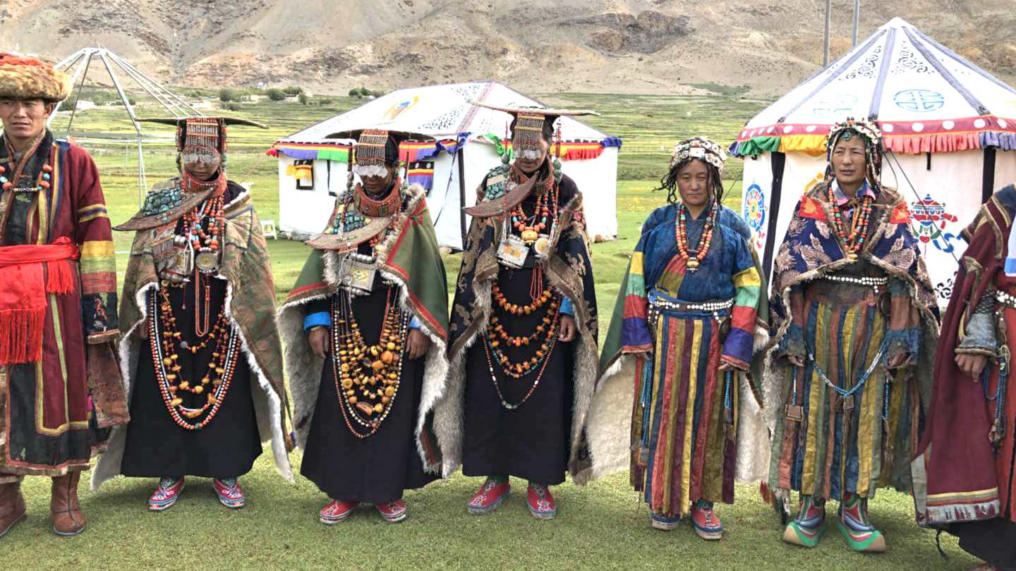 Local Tibetans perform a traditional dance in Kejia Village, Burang County. Their elaborate costumes were traditionally passed down from one generation to the next and feature rich necklaces and headdresses of turquoise, coral, gold and silver.