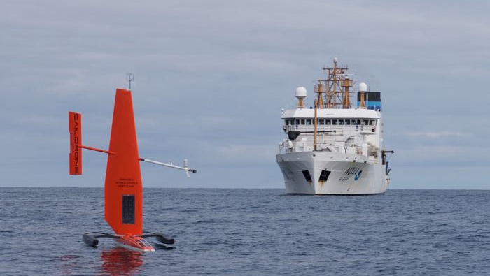 Saildrone operating with the Oscar Dyson in the Bering Sea in 2015. /Photo via Saildrone