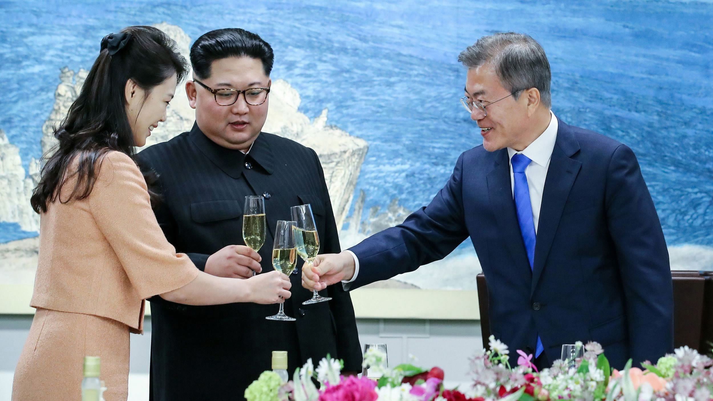 DPRK leader Kim Jong Un (C) and his wife Ri Sol Ju (L) toast with South Korean President Moon Jae-in during the official dinner at the end of their historic summit at the truce village of Panmunjom, April 27, 2018. /VCG Photo