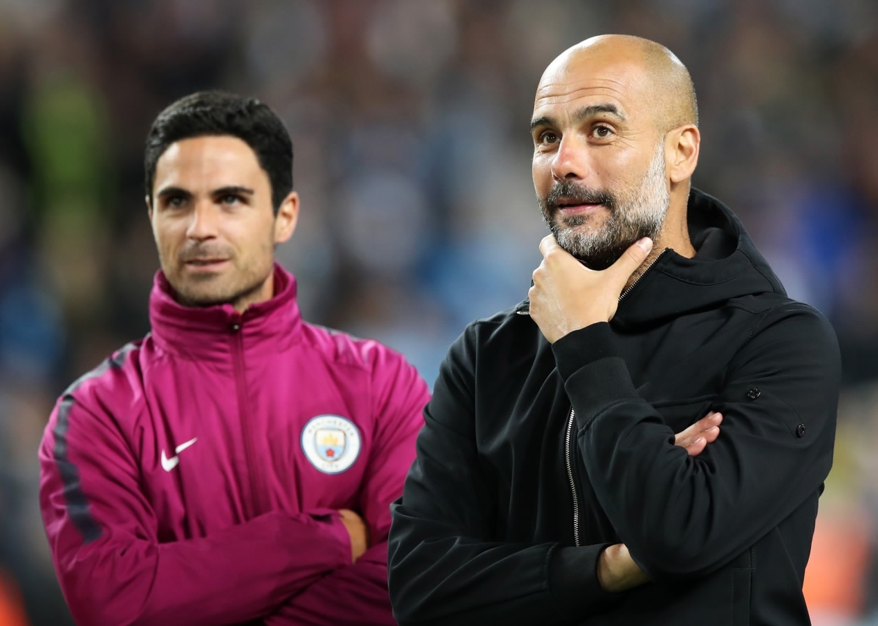 Mikel Arteta with Manchester City manager Pep Guardiola during a Premier League game at Etihad Stadium. /VCG Photo