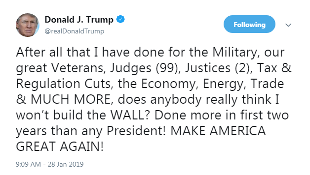 "Does anybody really think I won't build the WALL? Done more in first two years than any President!" Trump wrote on Twitter on Sunday evening.