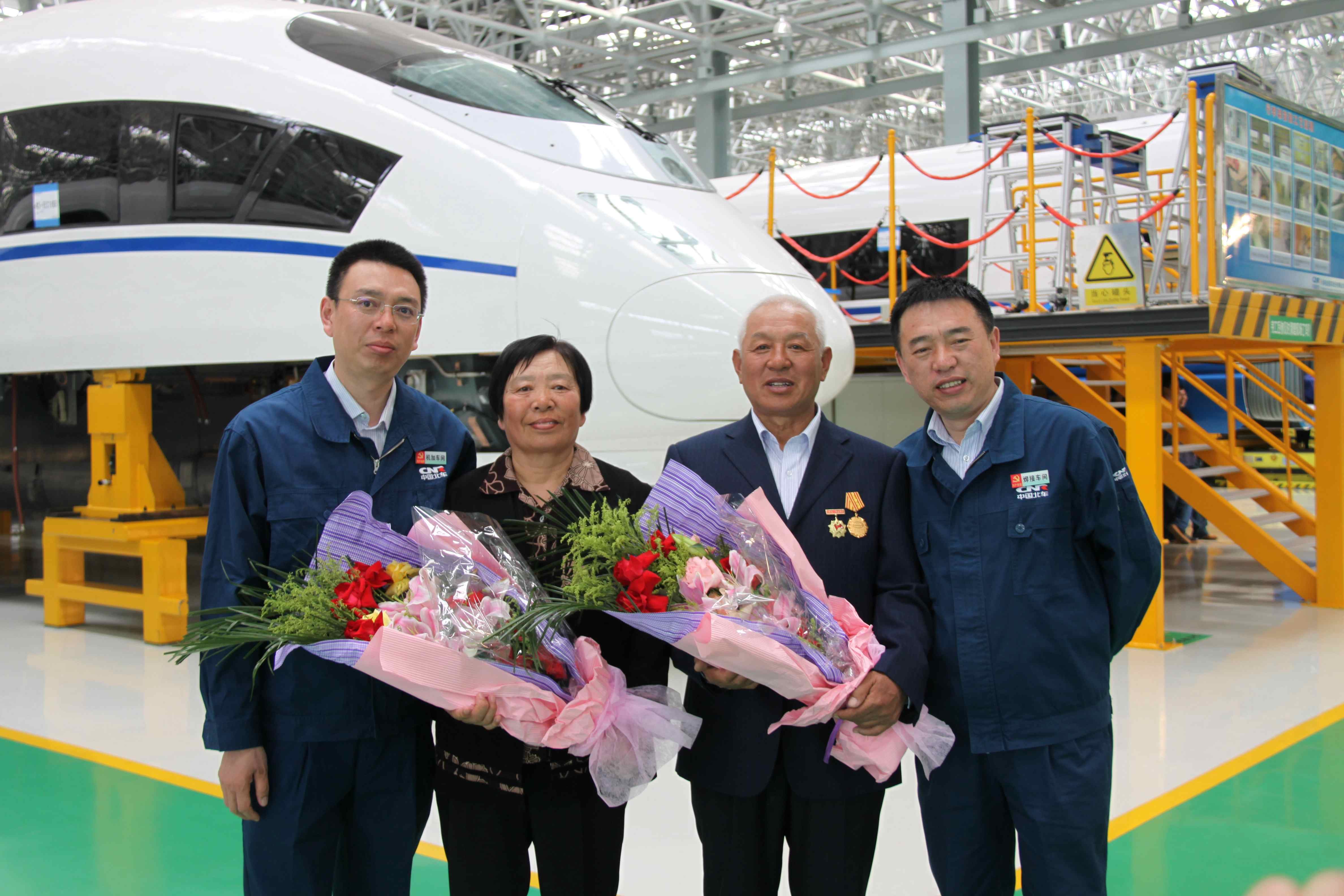 The Li family photo of train manufacturing in front of the new CRH train. / Photo by Li Wanjun
