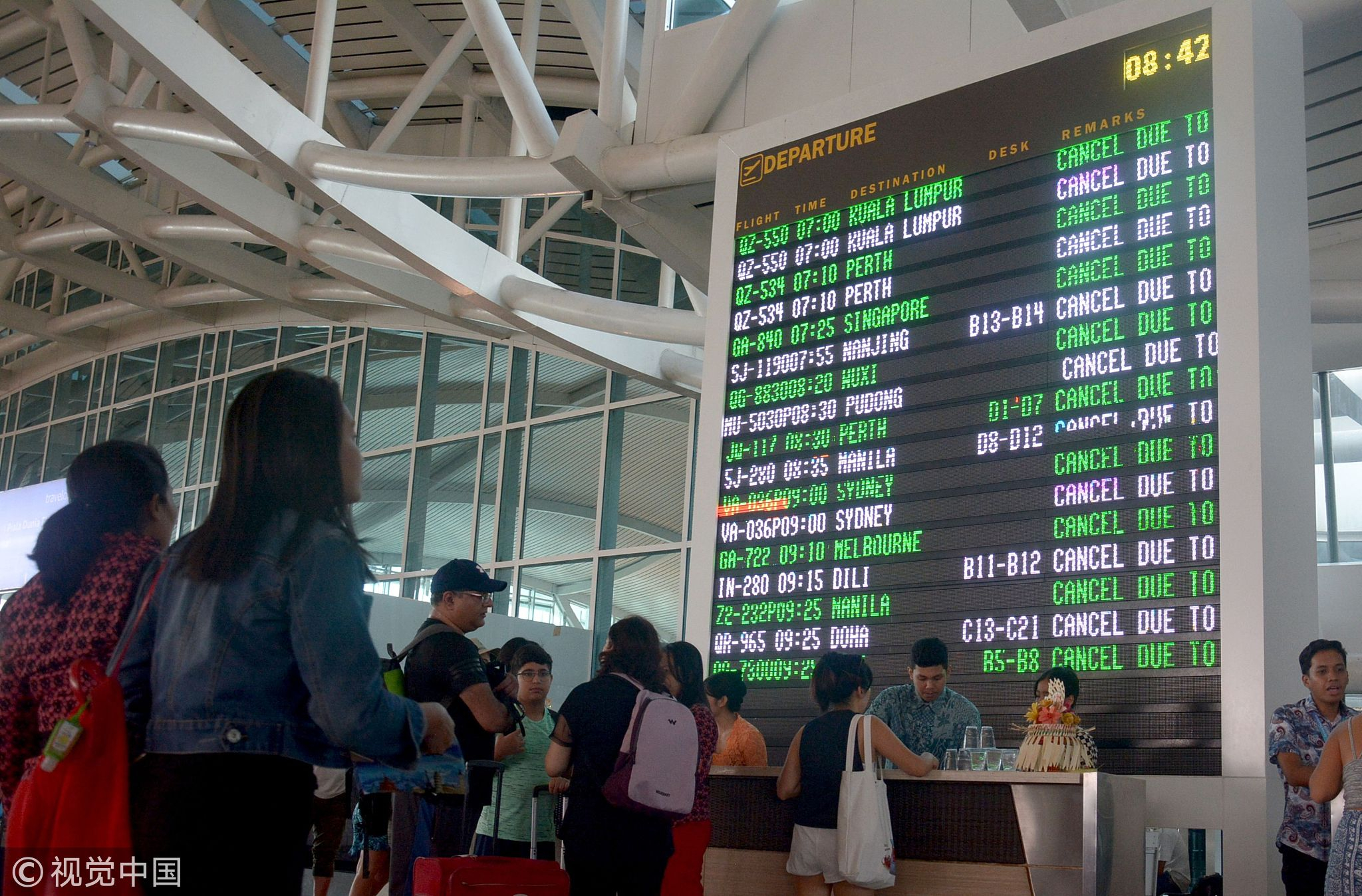Travelers check their flights at Ngurah Rai airport in Denpasar, Bali, which is closed on June 29, 2018 after a pilot report detected volcanic ash as high as 23,000 feet following Mount Agung's eruption. /VCG Photo
