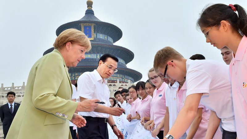 Premier Li and Chancellor Merkel sign on a memorial banner when meeting with youngsters attending the closing ceremony of the "Year of Languages” program between China and Germany at the Temple of Heaven in Beijing on July 7, 2014. /Xinhua Photo