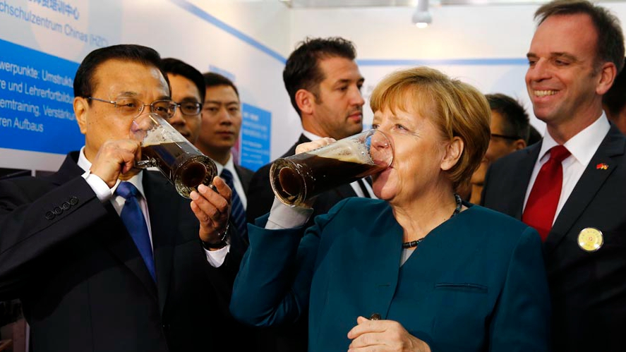 The two leaders tasted beer brewed by Chinese and German students during their visit to Hefei University in Hefei, capital of east China's Anhui Province on October 30, 2015. /Xinhua Photo