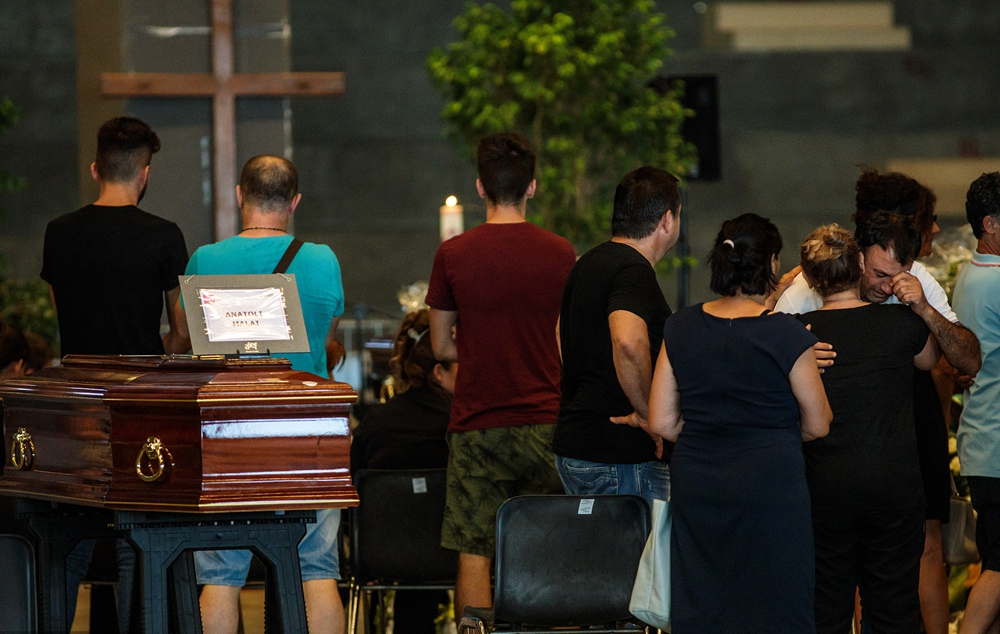 Relatives mourn victims of the Morandi Bridge disaster at the Fiera di Genova exhibition center in Genoa, Italy, where some of the coffins are laid in state, August 17, 2018. /VCG Photo