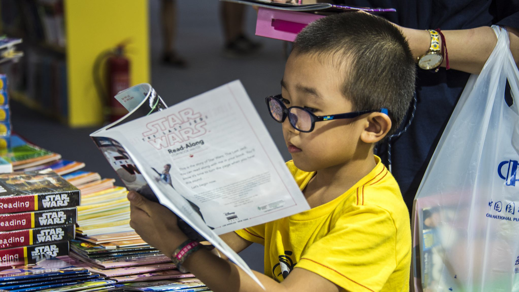 A child accompanied by his parent picks books at the 2018 Beijing International Book Fair. /VCG Photo