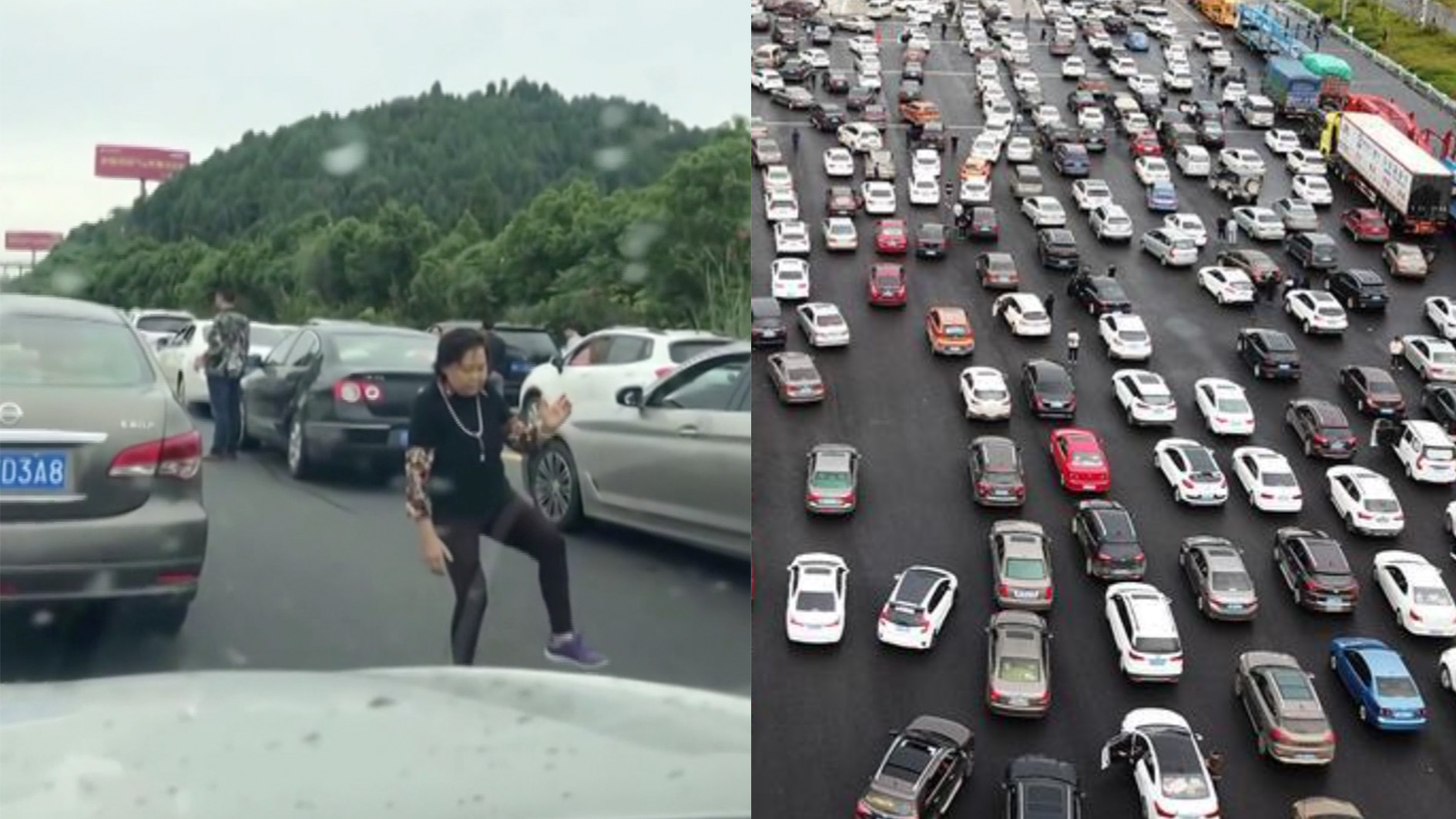 A Chinese woman performed Tai Chi on a highway while stranded in the heavy traffic during National Day's travel rush in Chengdu City, southwest China's Sichuan Province on October 1. China witnessed a travel rush as people embark on trips for the seven-day National Day holiday, which starts on October 1.