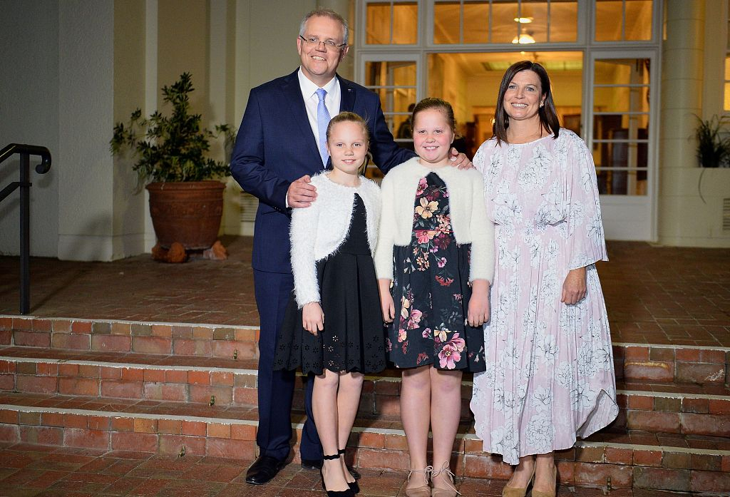 Australian Prime Minister Scott Morrison (L) poses for photos with his wife Jenny Morrison (R) and their two daughters in Canberra, August 24, 2018. /VCG Photo