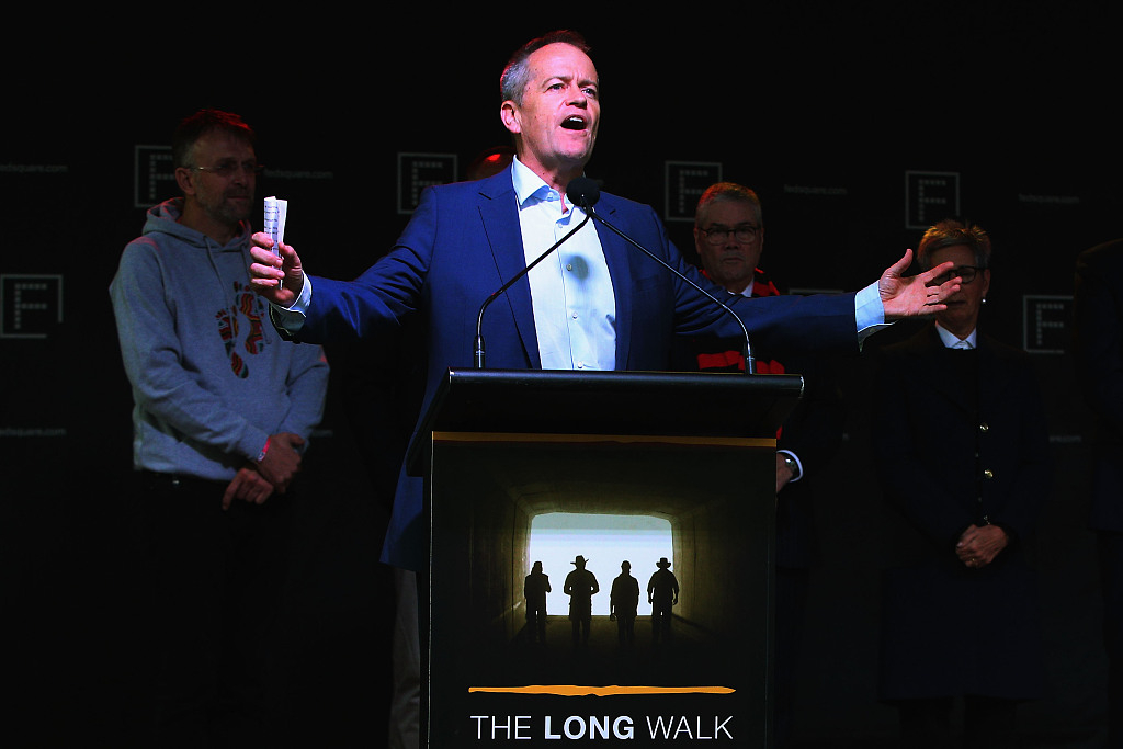 Bill Shorten speaks at Federation Square during the round 10 AFL match between the Richmond Tigers and the Essendon Bombers at Melbourne Cricket Ground in Melbourne, Australia, May 27, 2017. /VCG Photo