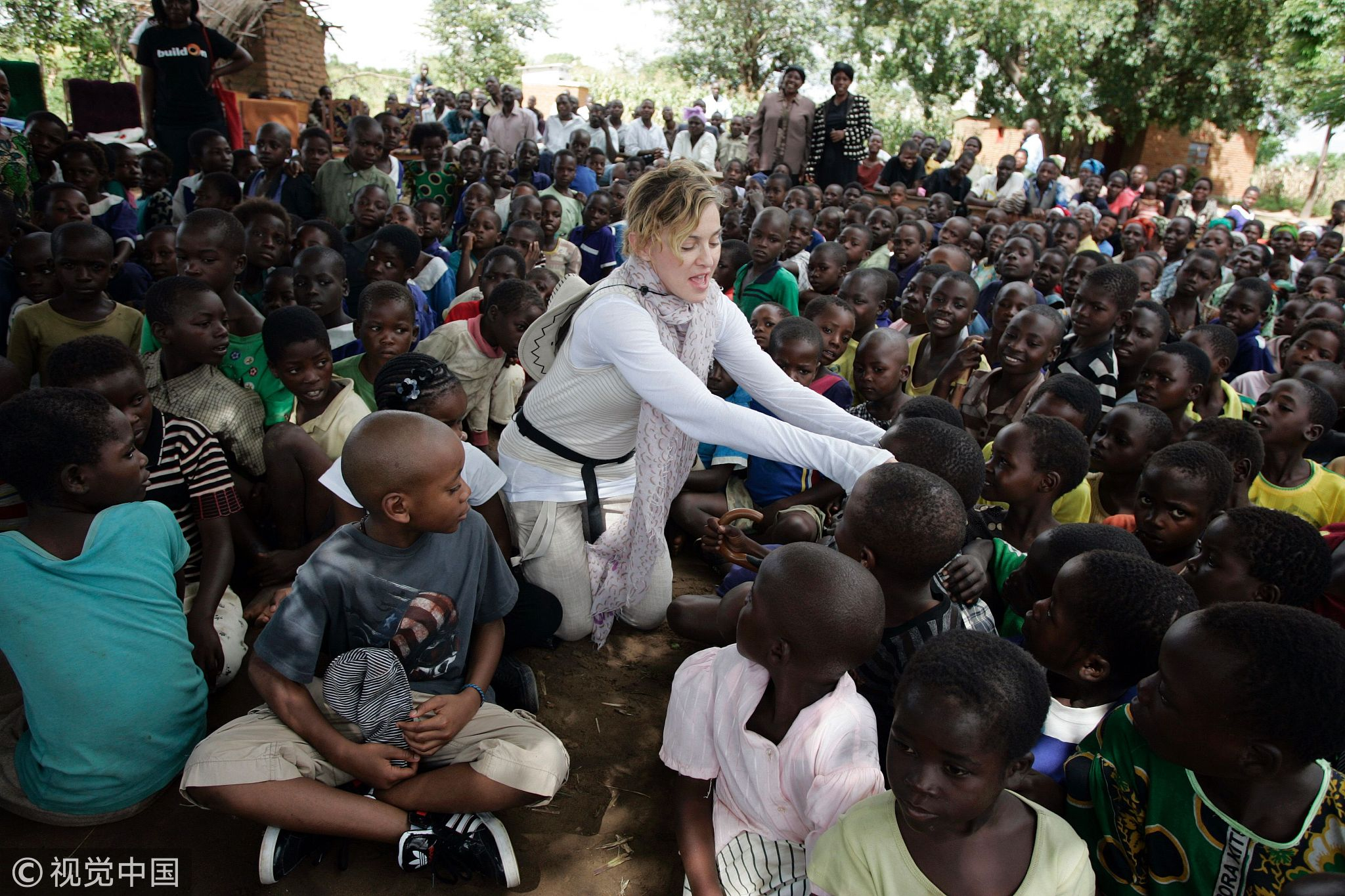 US Pop Star Madonna (C) interacts with Malawian children at Mkoko Primary School in the region of Kasungu, central Malawi, April 2, 2013. /VCG Photo