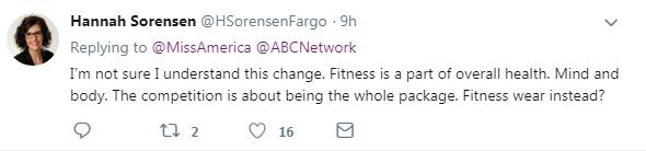“I’m not sure I understand this change. Fitness is a part of overall health. Mind and body,” @HSorensenFargo commented on Twitter. “The competition is about being the whole package. Fitness wear instead?”