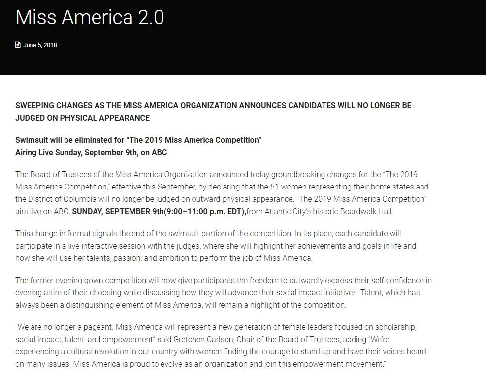 “We are no longer a pageant. We are a competition,” Gretchen Carlson, chairwoman of the Board of Trustees of the Miss America Organization said during an interview with ABC News. “We will no longer judge our candidates on their outward physical appearance.”