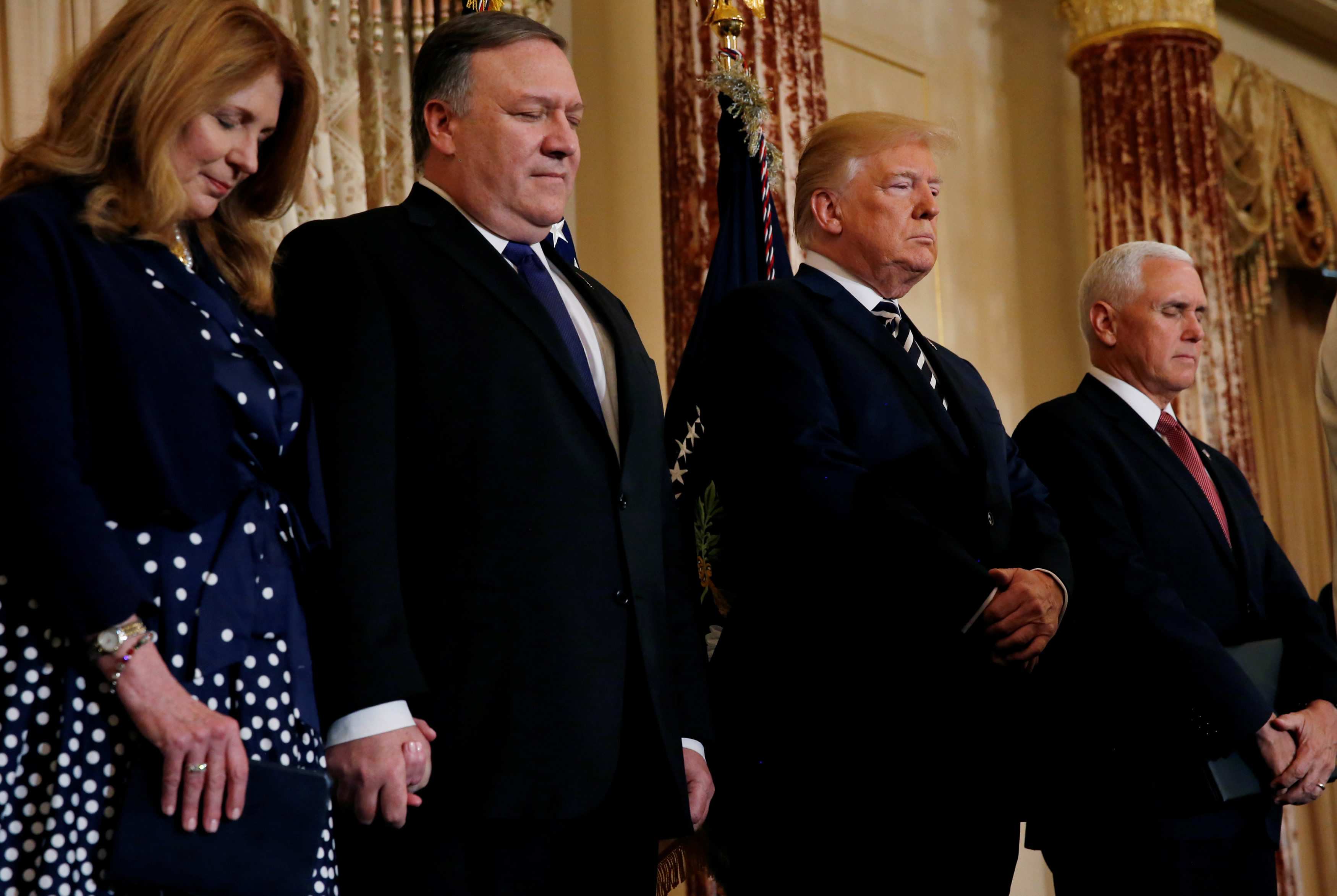 US Secretary of State Mike Pompeo, his wife Susan, President Donald Trump and Vice President Mike Pence bow their heads in prayer, during Pompeo's swearing-in ceremony, at the Department of State in Washington, May 2, 2018. /Reuters Photo
