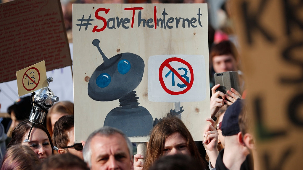People protest against the planned EU copyright reform in Berlin, Germany, March 23, 2019. /VCG Photo