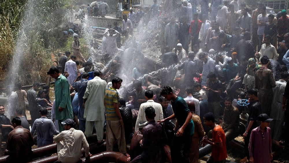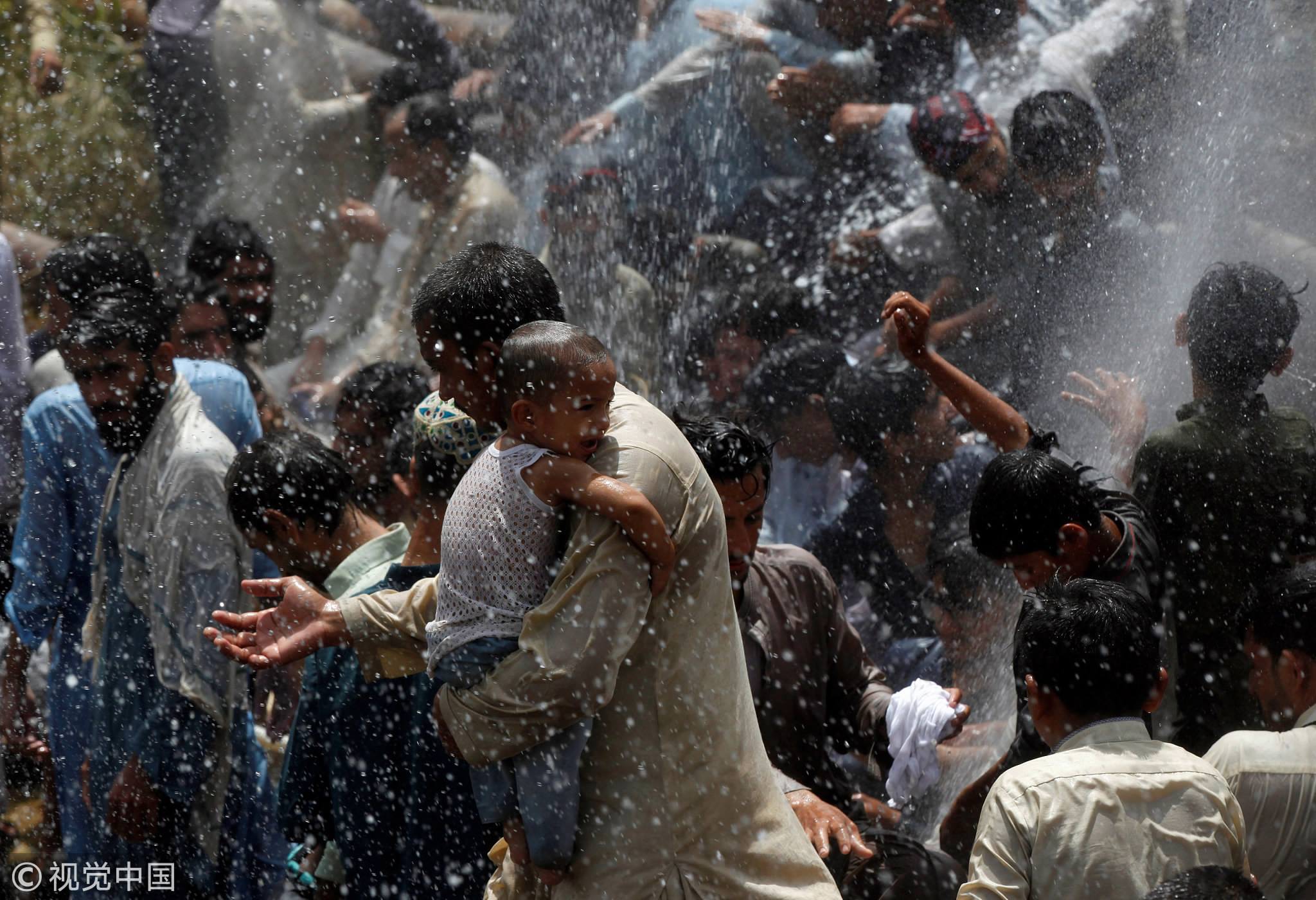 Men and children cool off from the heatwave, as they are sprayed with water jetting out from a leaking water pipeline in Karachi, Pakistan, May 22, 2018. /VCG Photo