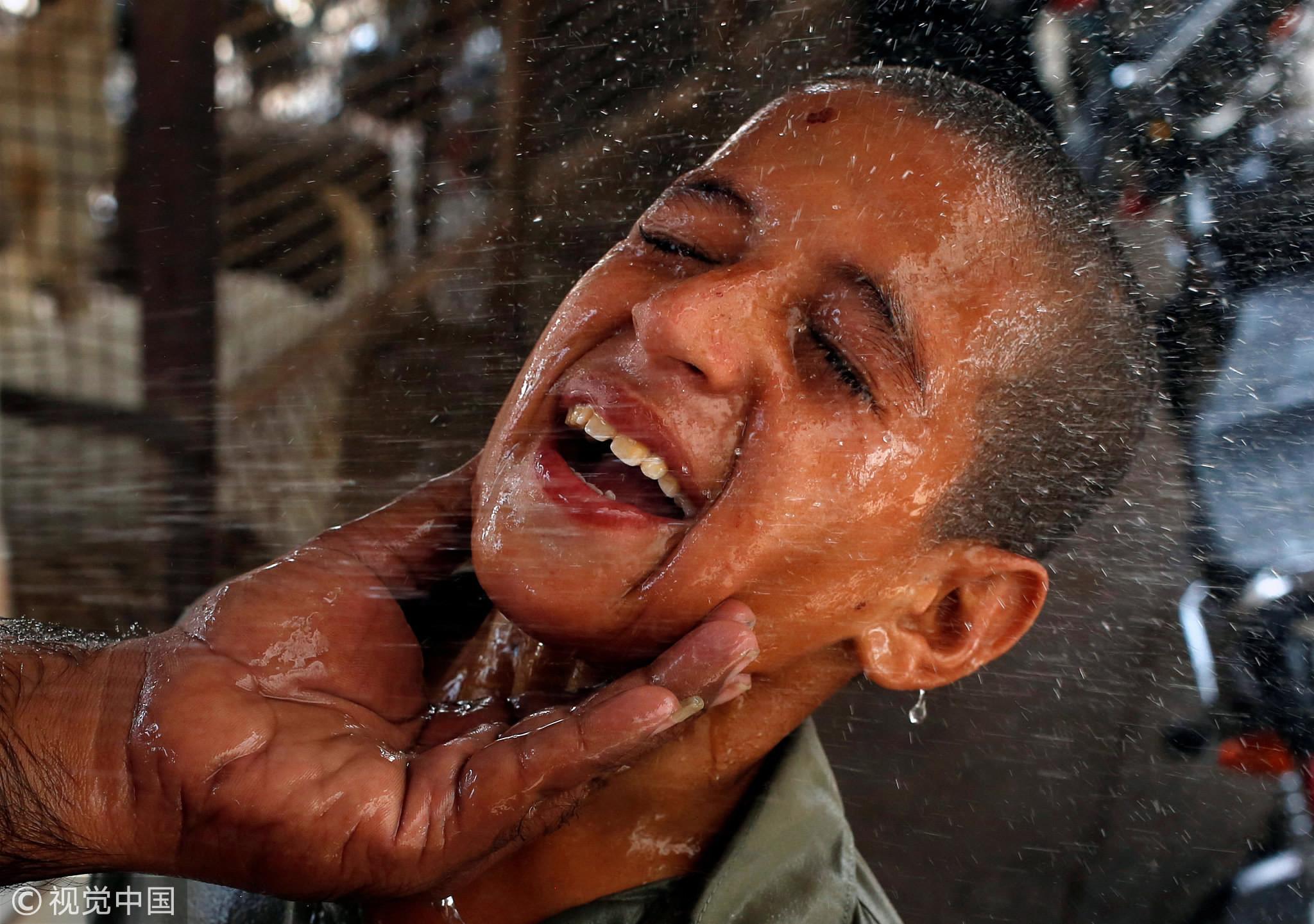 A boy reacts as he receives a spray of cold water, to avoid the intense heatwave, at a stall, setup by a social welfare organization in Karachi, Pakistan, May 22, 2018. /VCG Photo