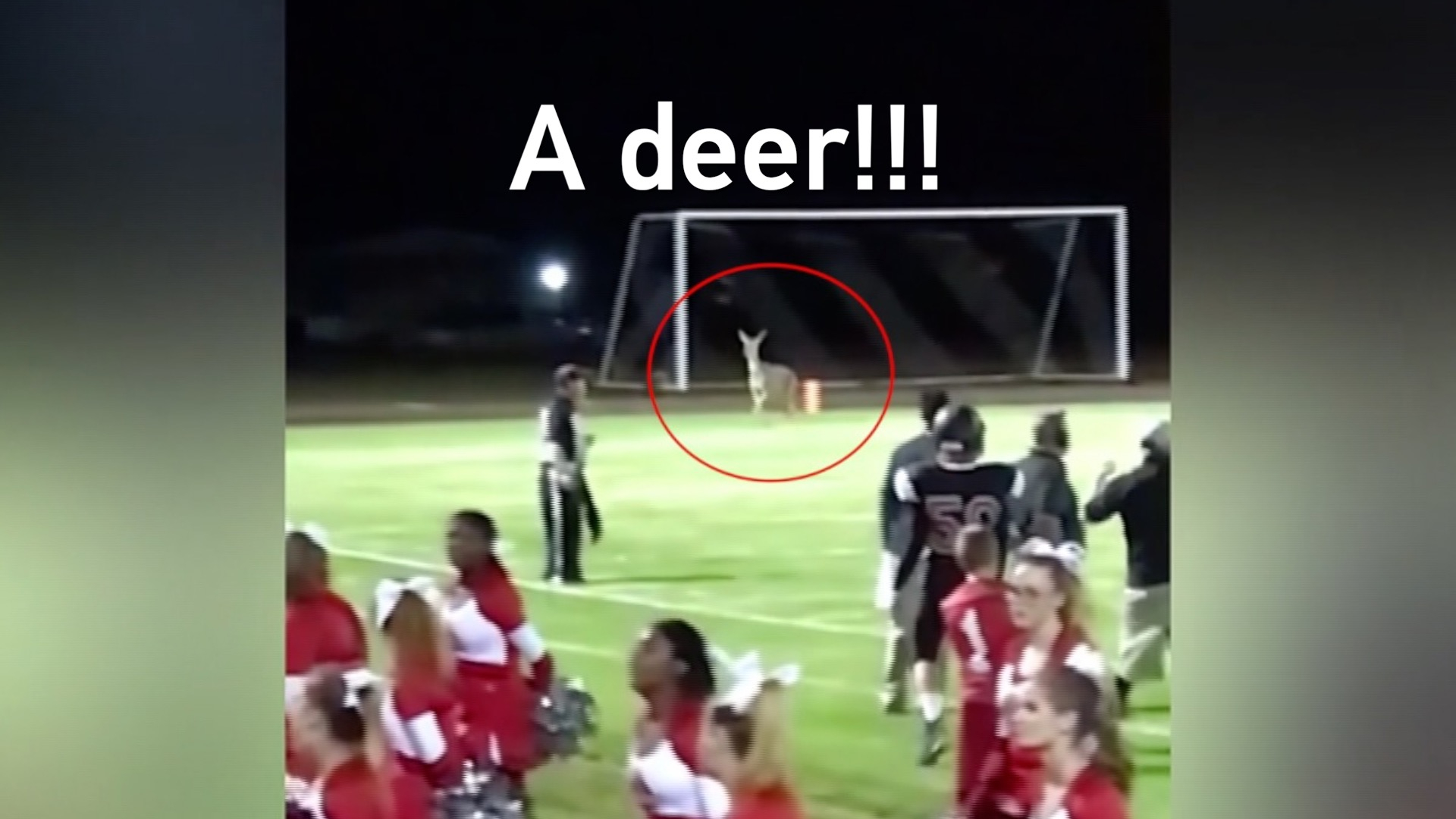 This is the moment a disoriented deer invaded a high school football field in Washington state and made the crowd go wild.
