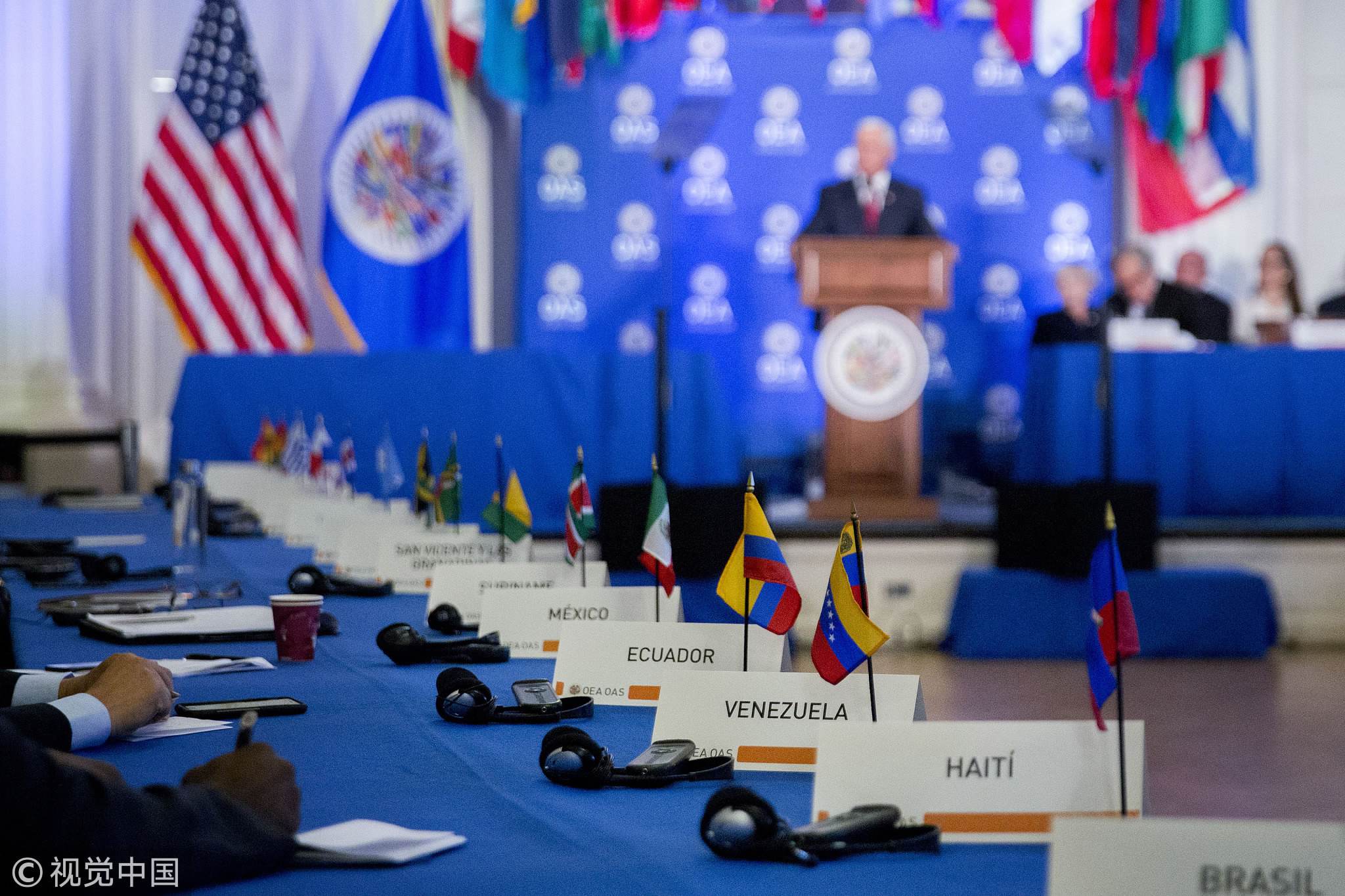 The Venezuelan flag and placard sit on a table while US Vice President Mike Pence, top center, speaks in the Hall of the Americas at the Organization of American States (OAS) in Washington, DC, US, on Monday, May 7, 2018. /VCG Photo