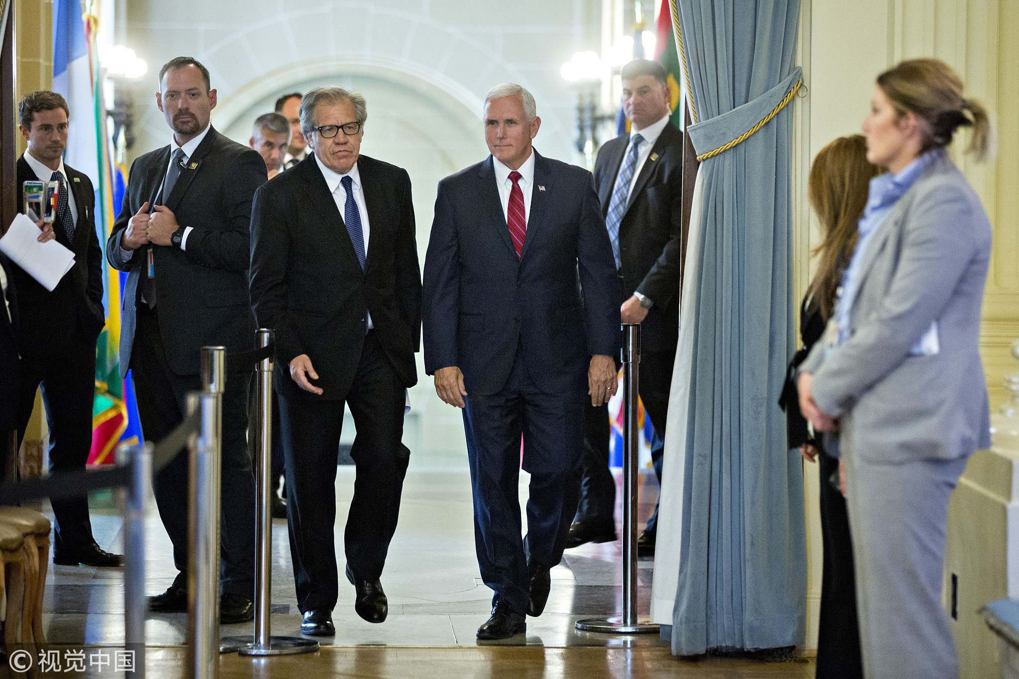 US Vice President Mike Pence, right, and Luis Almagro, secretary general of the Organization of American States (OAS), arrive at a news conference in the Hall of the Americas at the OAS in Washington, DC, US, on Monday, May 7, 2018. /VCG Photo