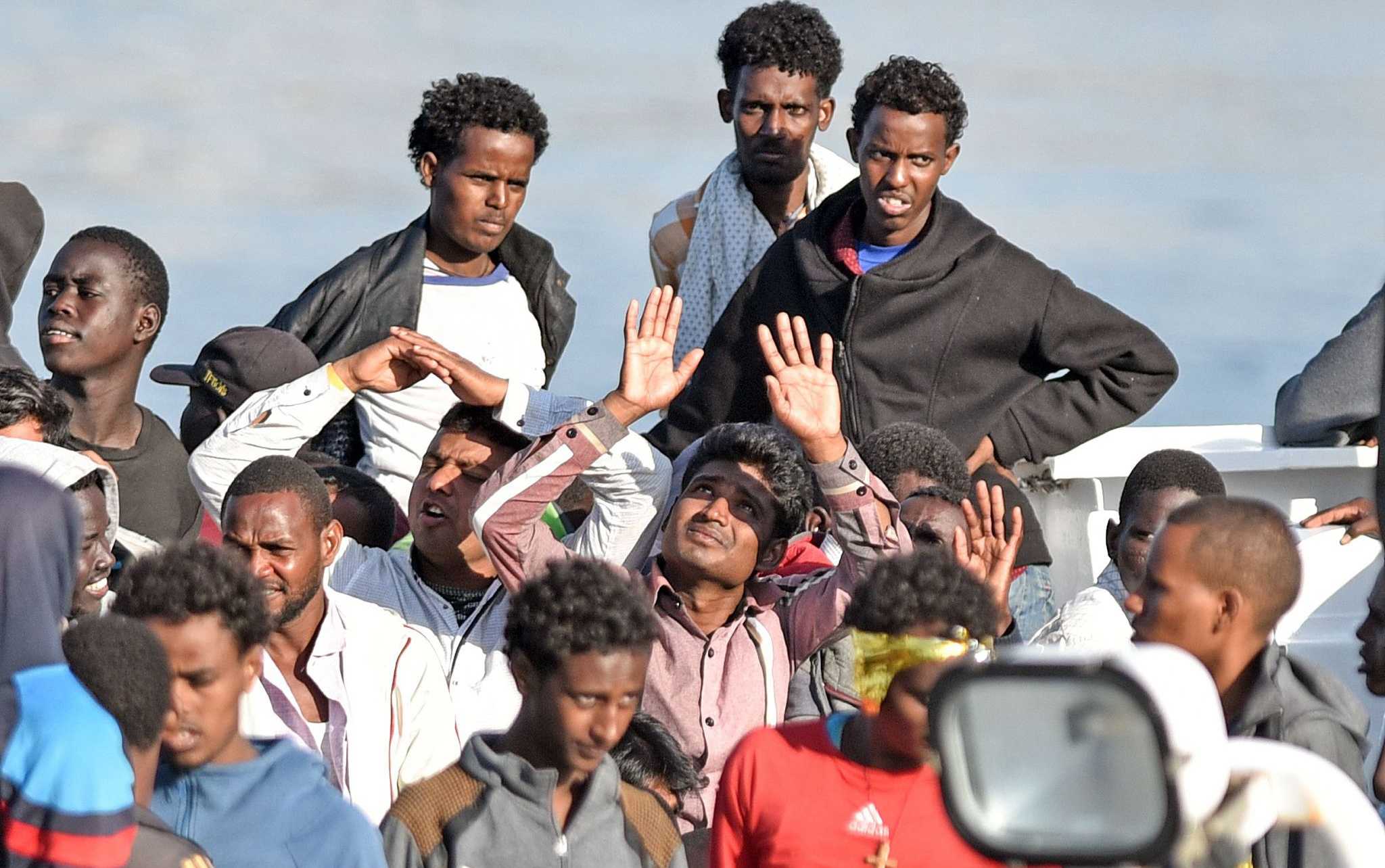 Men wait to disembark from the Italian Coast Guard vessel "Diciotti" following a rescue operation of migrants and refugees at sea in the port of Catania, Sicily, June 13, 2018. /VCG Photo