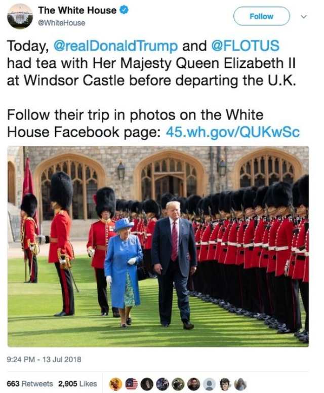 The tweet, posted by @WhiteHouse on Friday, said Donald Trump and first lady Melania Trump “had tea with Her Majesty Queen Elizabeth II at Windsor Castle before departing the U.K.” The post was later deleted after Twitter users highlighted the mistake.