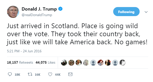 On June 24, 2016, the day after the Brexit referendum, Trump posted on Twitter “Just arrived in Scotland. Place is going wild over the vote. They took their country back, just like we will take America back. No games!”