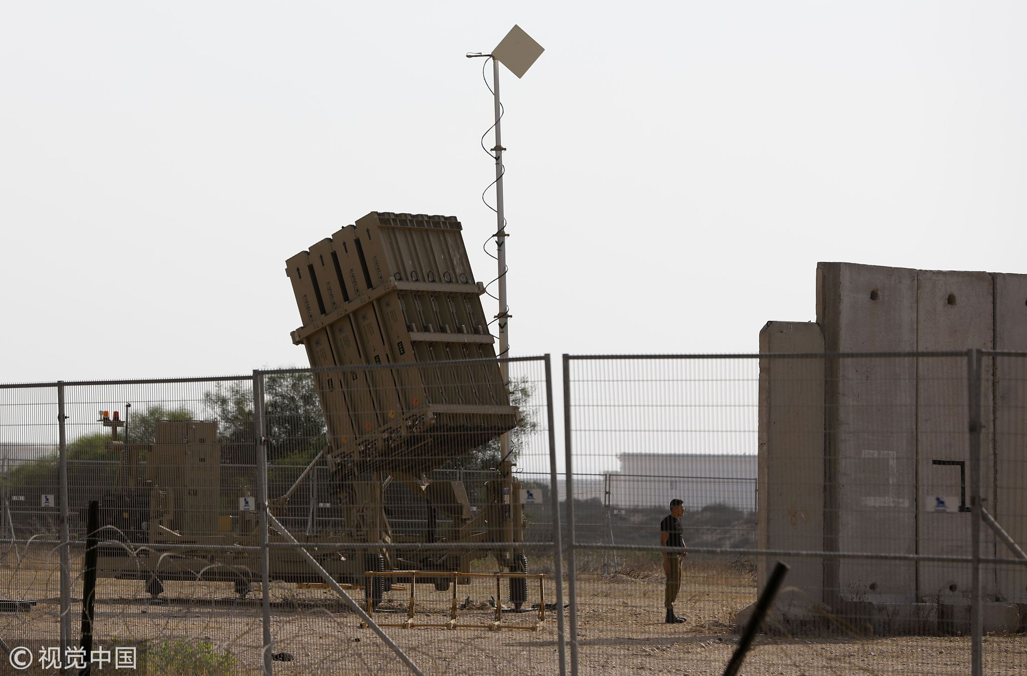 An Israeli soldier stands next to an Iron Dome defence system, designed to intercept and destroy incoming short-range rockets and artillery shells, near the city of Ashkelon on July 14, 2018. /VCG Photo