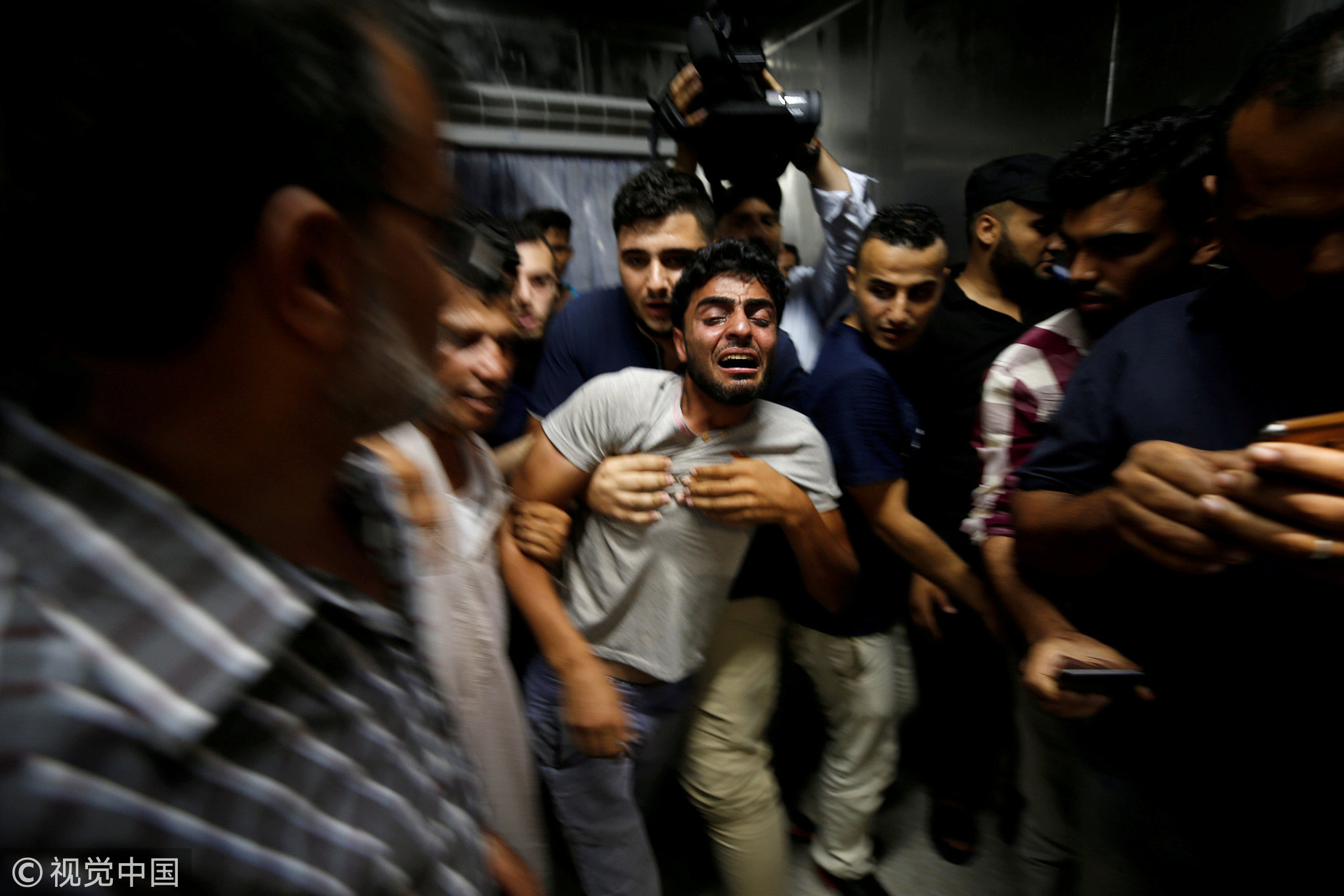 The brother of a Palestinian teenager who was killed in an Israeli air strike reacts in Gaza City July 14, 2018. /VCG Photo