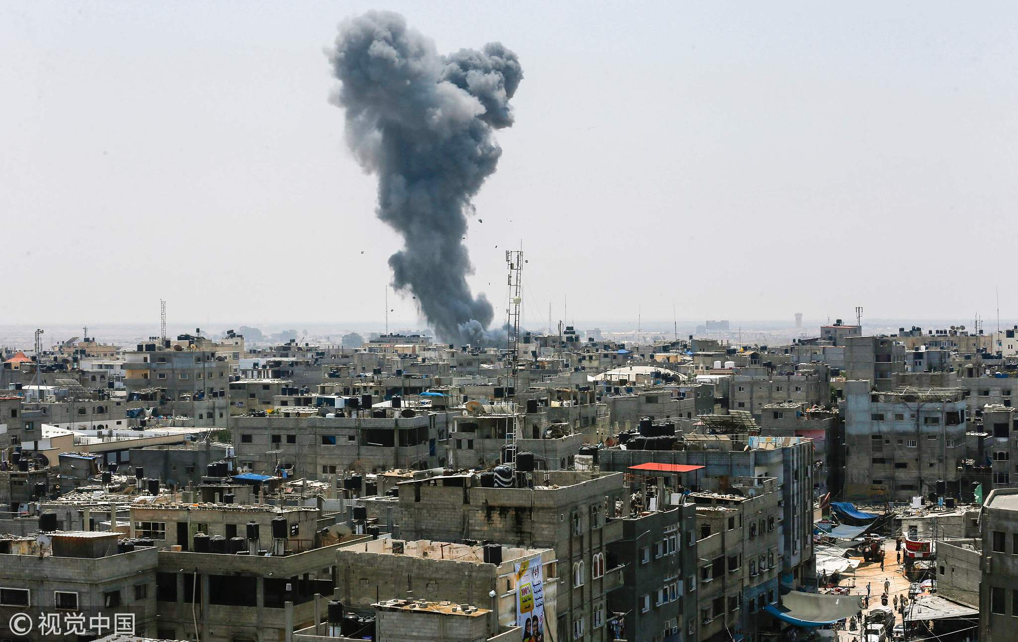 A smoke plume rises following an Israeli air strike in the southern Gaza Strip city of Rafah, near the border with Egypt on July 14, 2018. /VCG Photo