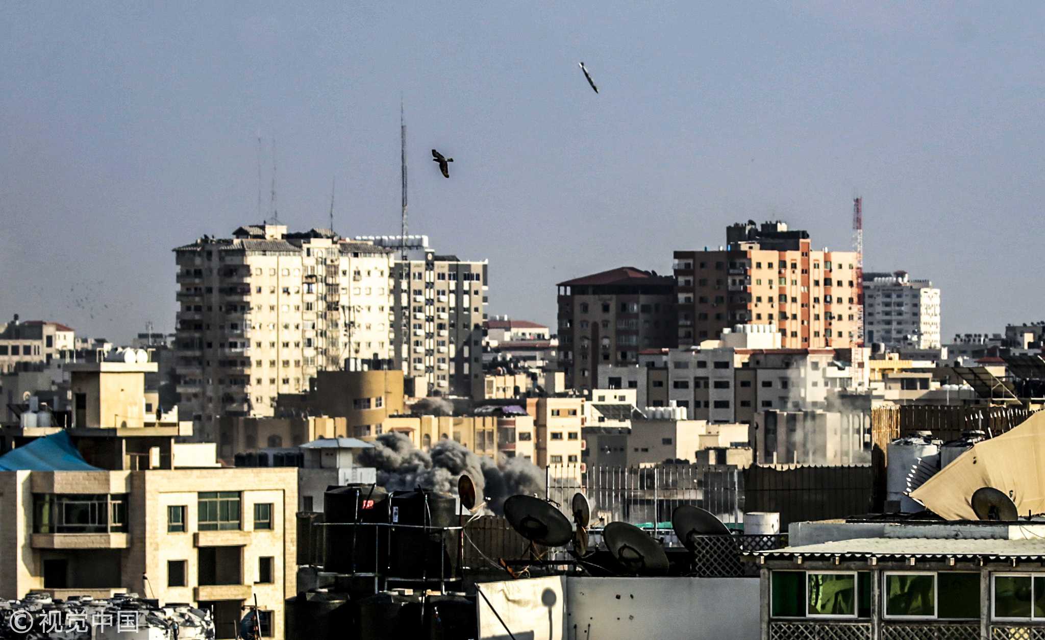 A bomb landing during Israeli airstrikes in Gaza City on July 14, 2018. /VCG Photo