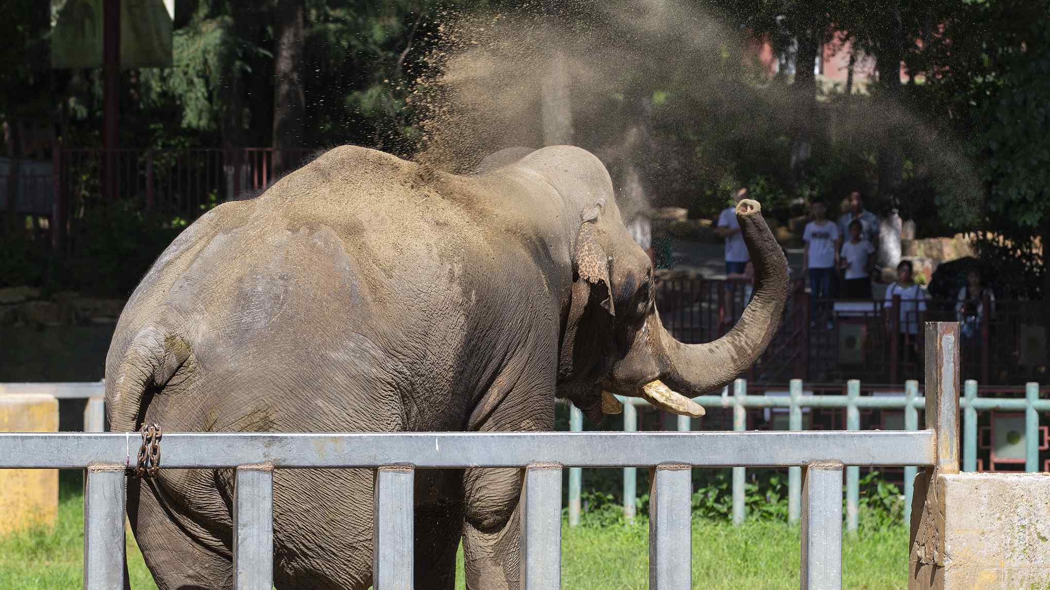 An elephant sprays dust on itself in Nanjing. /VCG Photo