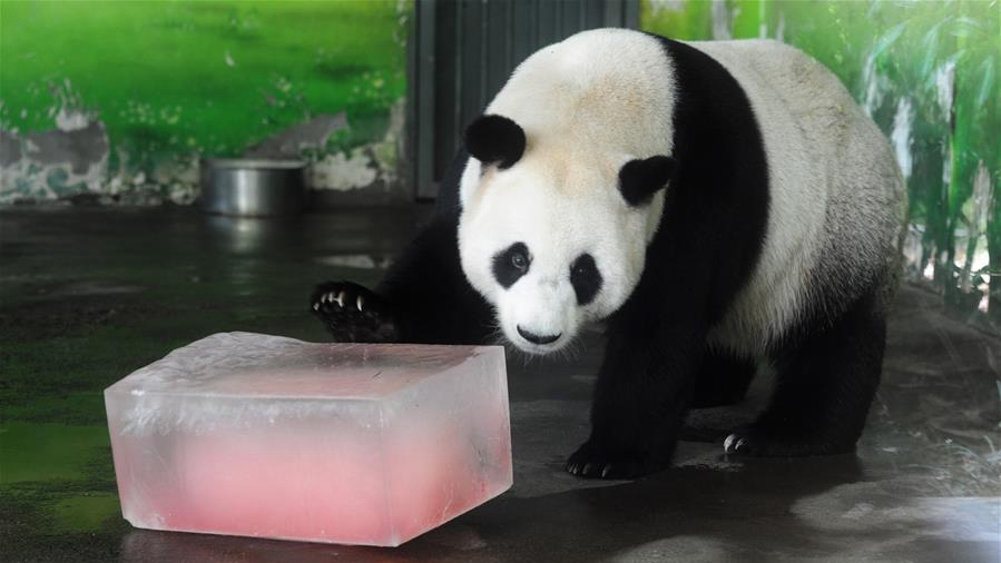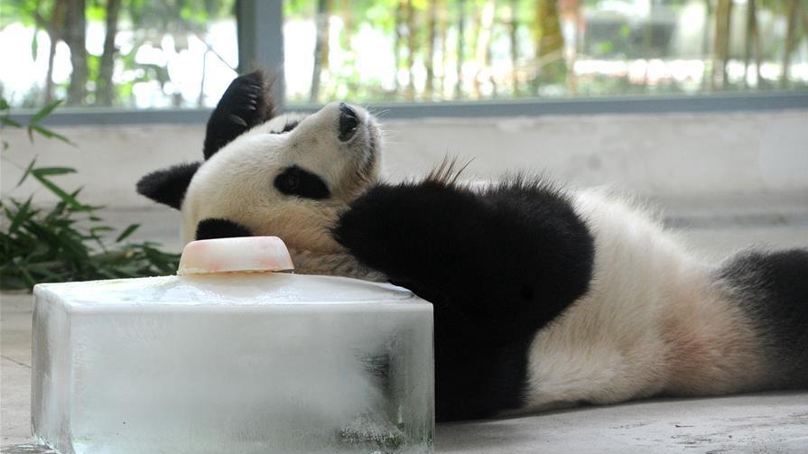 A giant panda lies on a piece of ice to cool off. /Xinhua Photo
