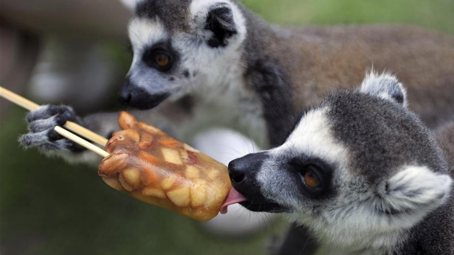 A monkey was seen swimming in the pool carrying its cub, while a group of ring-tailed lemurs have their fair share of ice creams in Qingdao Forest Wildlife World.