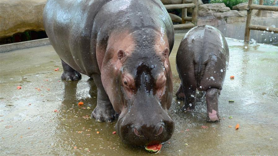 Hippos eat watermelon to cool off from hot weather at Qingdao Forest Wildlife World. /Xinhua Photo