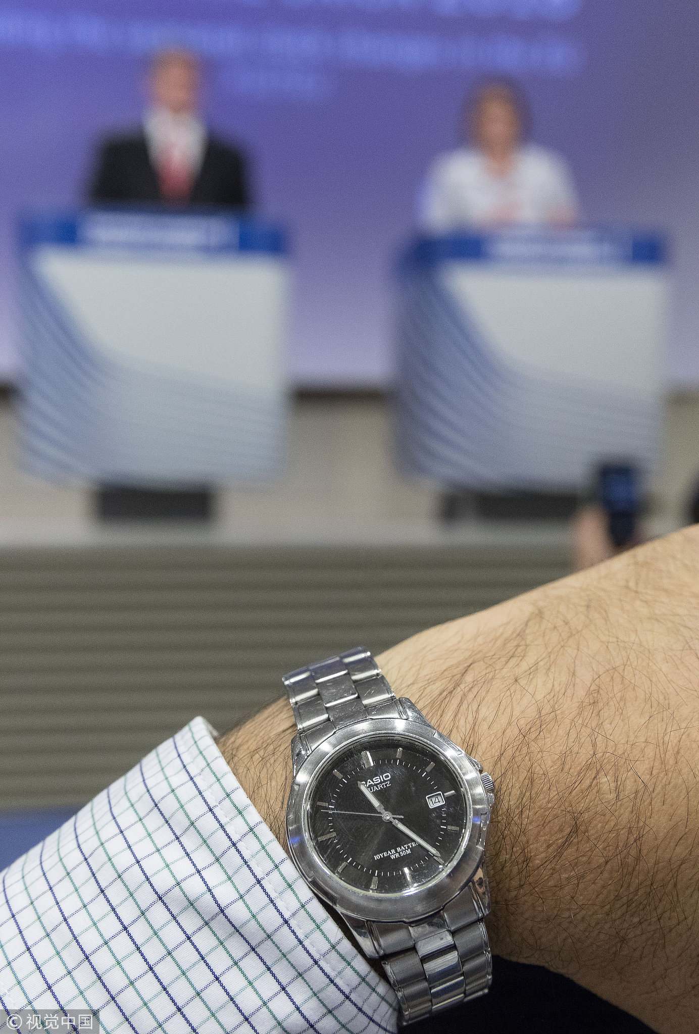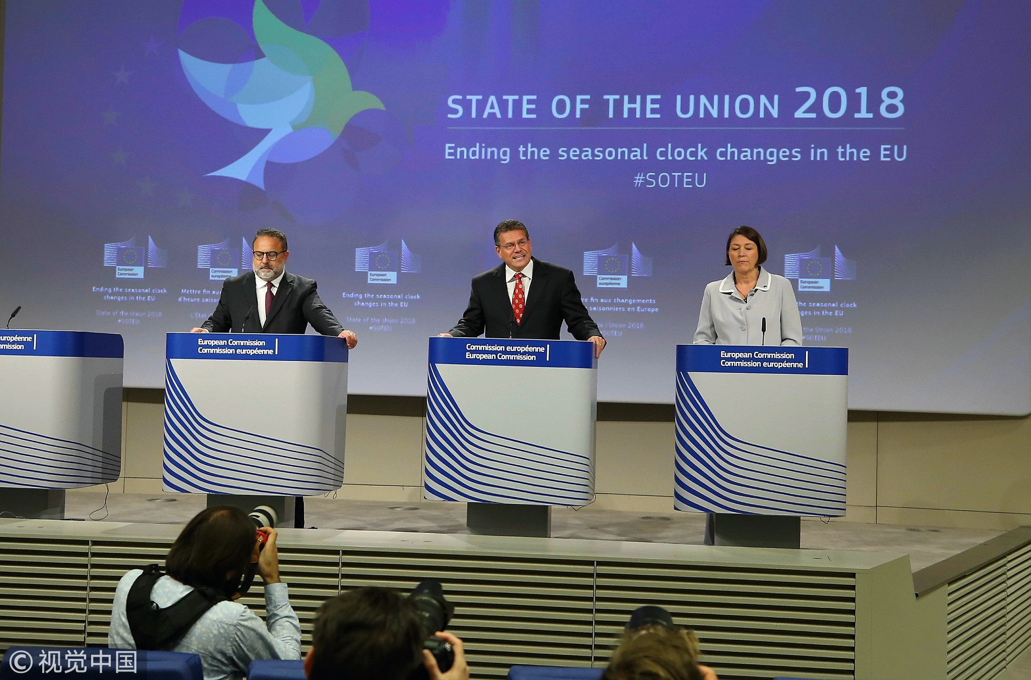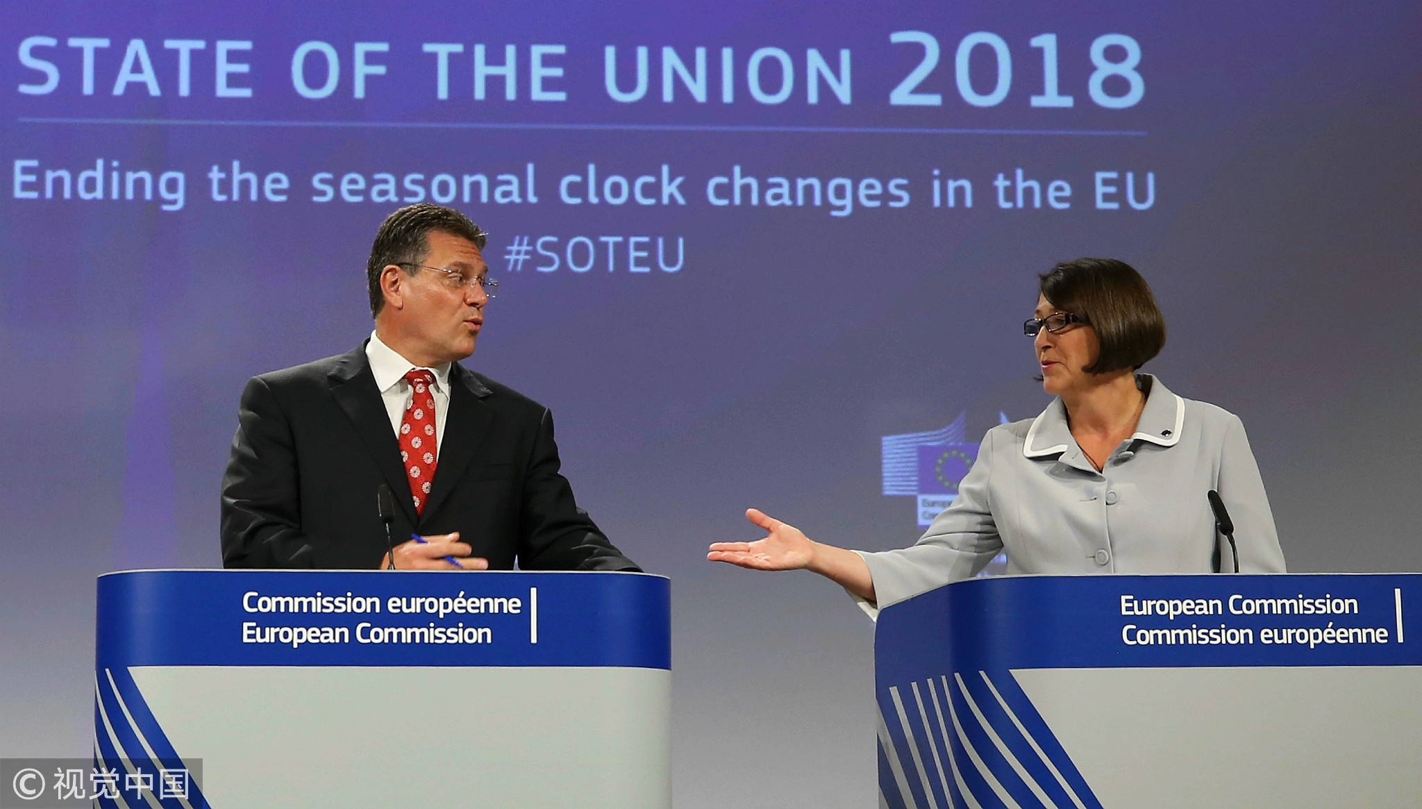European Commissioner for Energy Union Maros Sefcovic (L) and EU Transport Commissioner Violeta Bulc (R) address a press conference regarding the end of seasonal clock changes in the EU in Brussels, Belgium, September 14, 2018. /VCG Photo