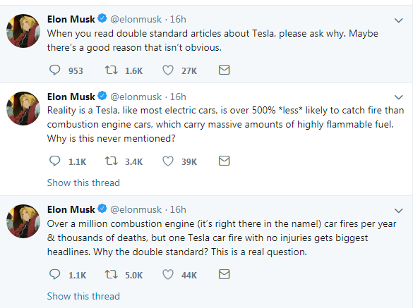 Just a week ago, he complained about media's "double standard" over Tesla issue in three consecutive tweets, saying that over one million combustion engine vehicle fires every year, but onlyTesla made big headlines.