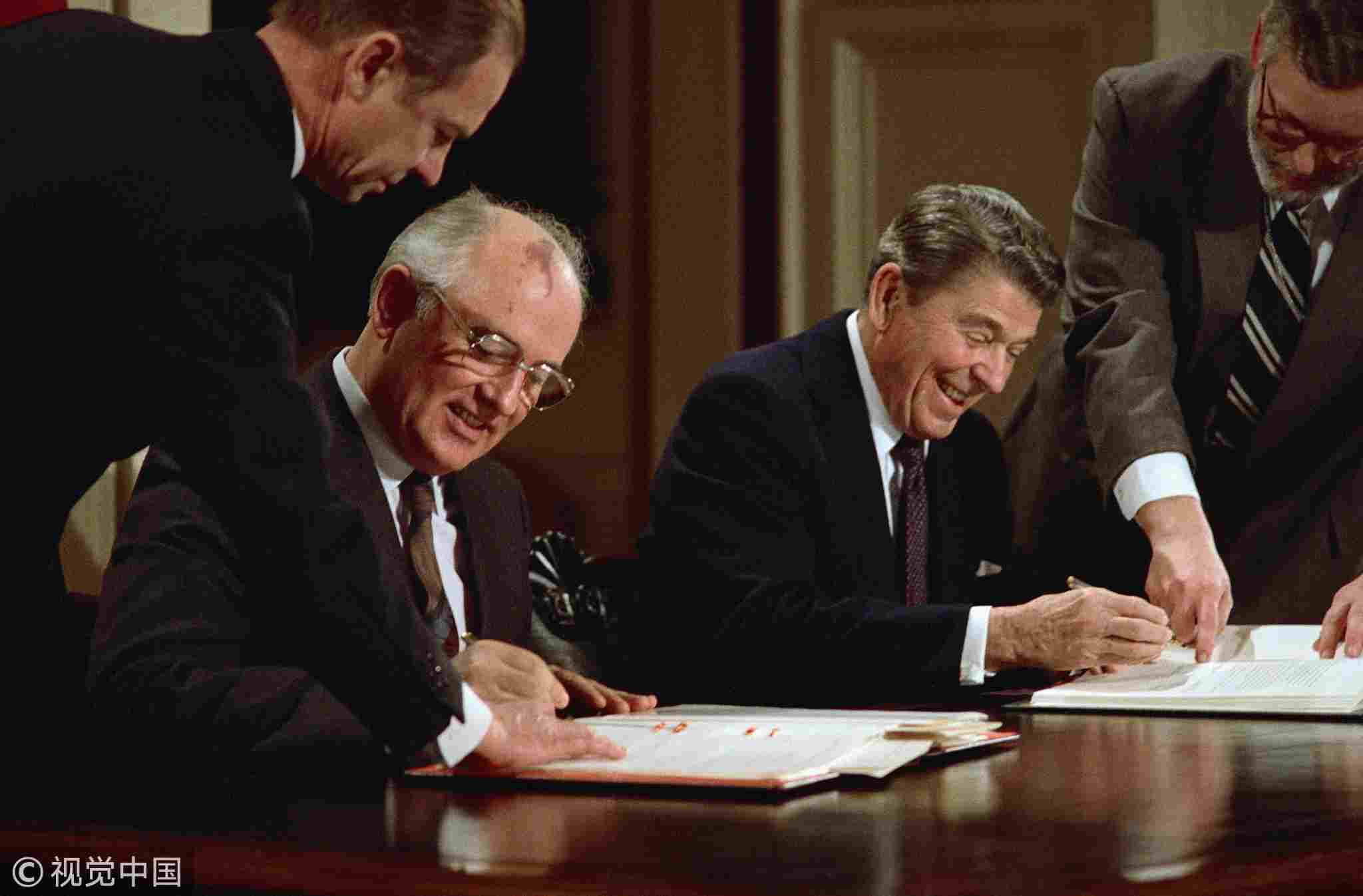 President Ronald Reagan and Soviet General Secretary Mikhail Gorbachev signing the arms control agreement banning the use of intermediate-range nuclear missiles, the Intermediate Nuclear Forces Reduction Treaty./ VCG Photo