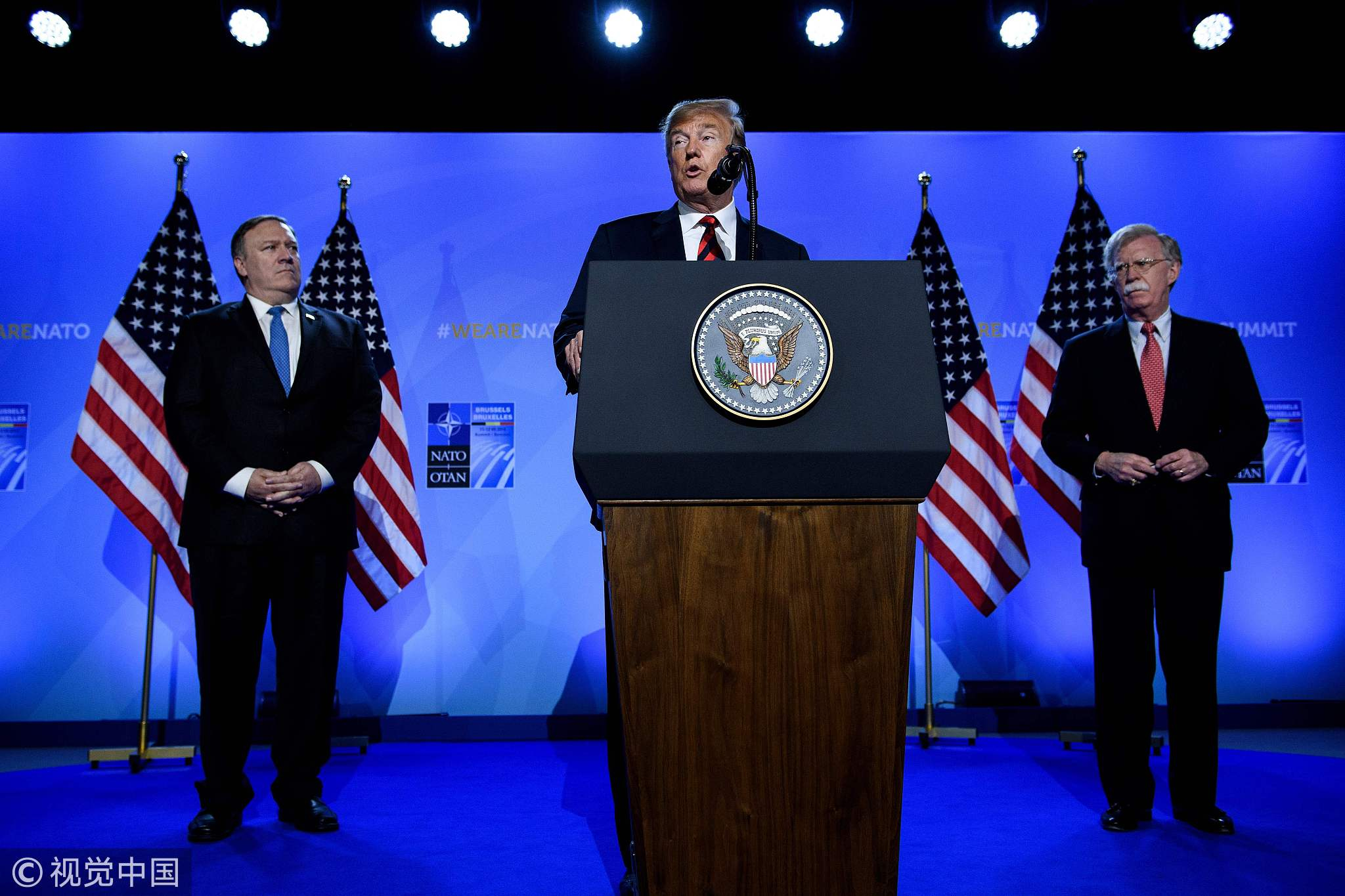 US President Donald Trump (C) is accompanied by US Secretary of State Mike Pompeo (L) and US National Security Adviser John Bolton (R) as he addresses a press conference on the second day of the North Atlantic Treaty Organization (NATO) summit in Brussels on July 12, 2018./ VCG Photo