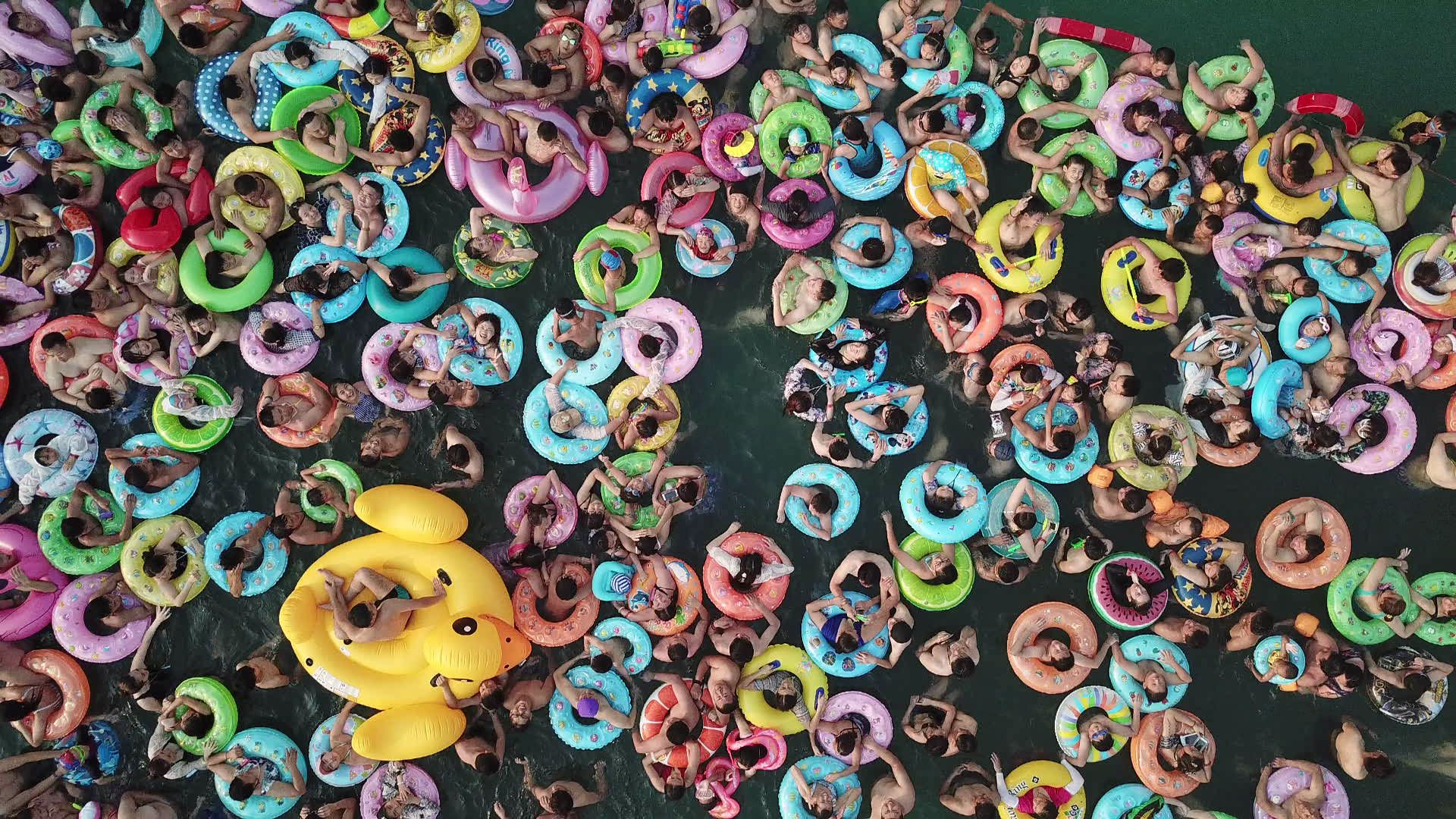 Hundreds of people in China crowded a giant pool, creating what looks like a massive bowl of Fruit Loops, to get a break from soaring temperatures.