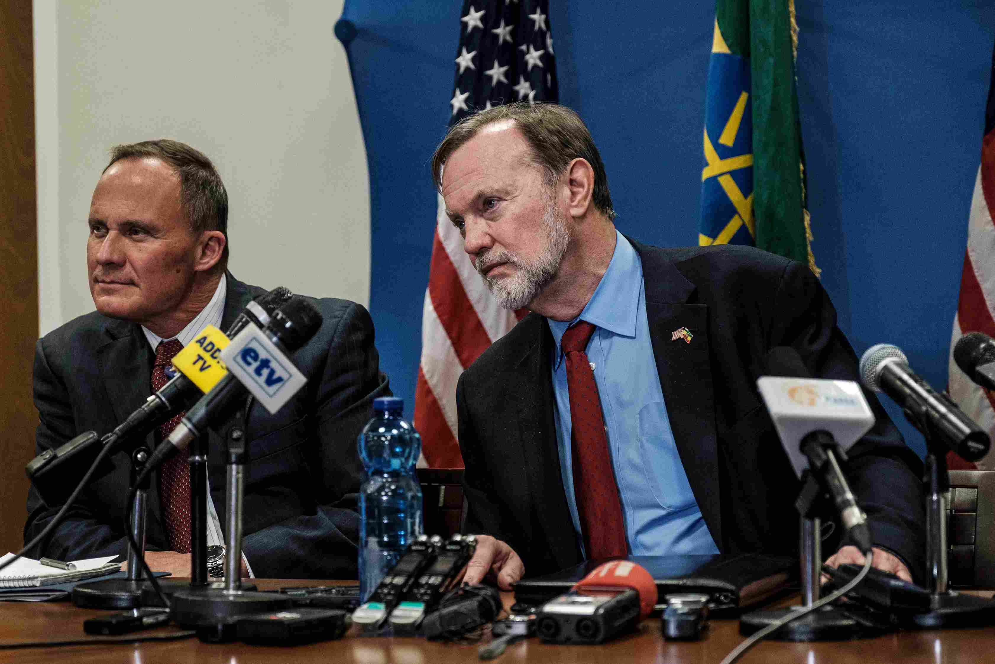 Assistant Secretary of State for African Affairs Tibor Nagy (R) listens to a question during a press conference at the U.S. Embassy in Addis Ababa, Ethiopia, November 30, 2018. /VCG Photo