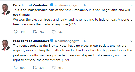 "The scenes today at the Bronte Hotel have no place in our society and we are urgently investigating the matter to understand exactly what happened," Mnangagwa wrote on Twitter.