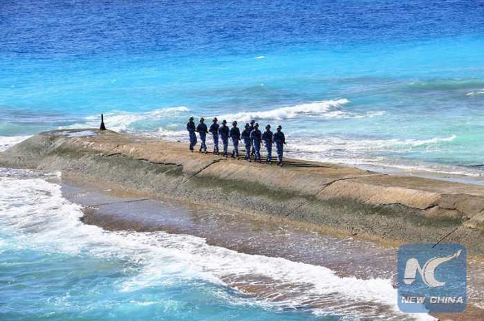 Chinese soldiers patrol a breakwater on Yongshu Reef in the South China Sea, January 6, 2016. /Xinhua Photo