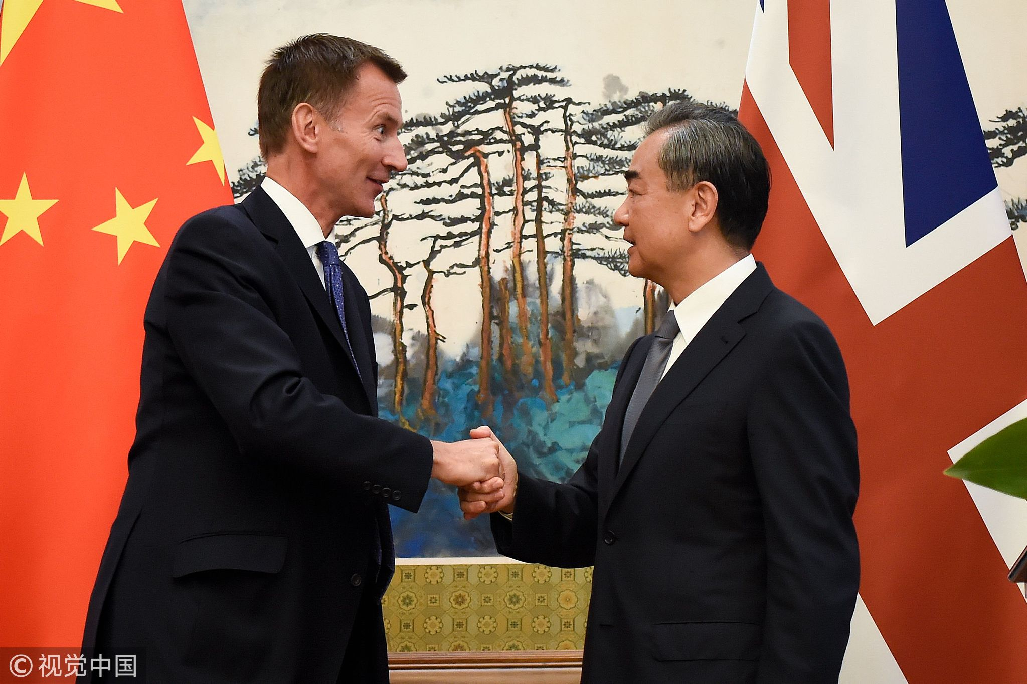 July 30, 2018: Britain's Foreign Secretary Jeremy Hunt (L) shakes hands with China's Foreign Minister Wang Yi after a press conference at Diaoyutai State Guesthouse in Beijing./ VCG Photo