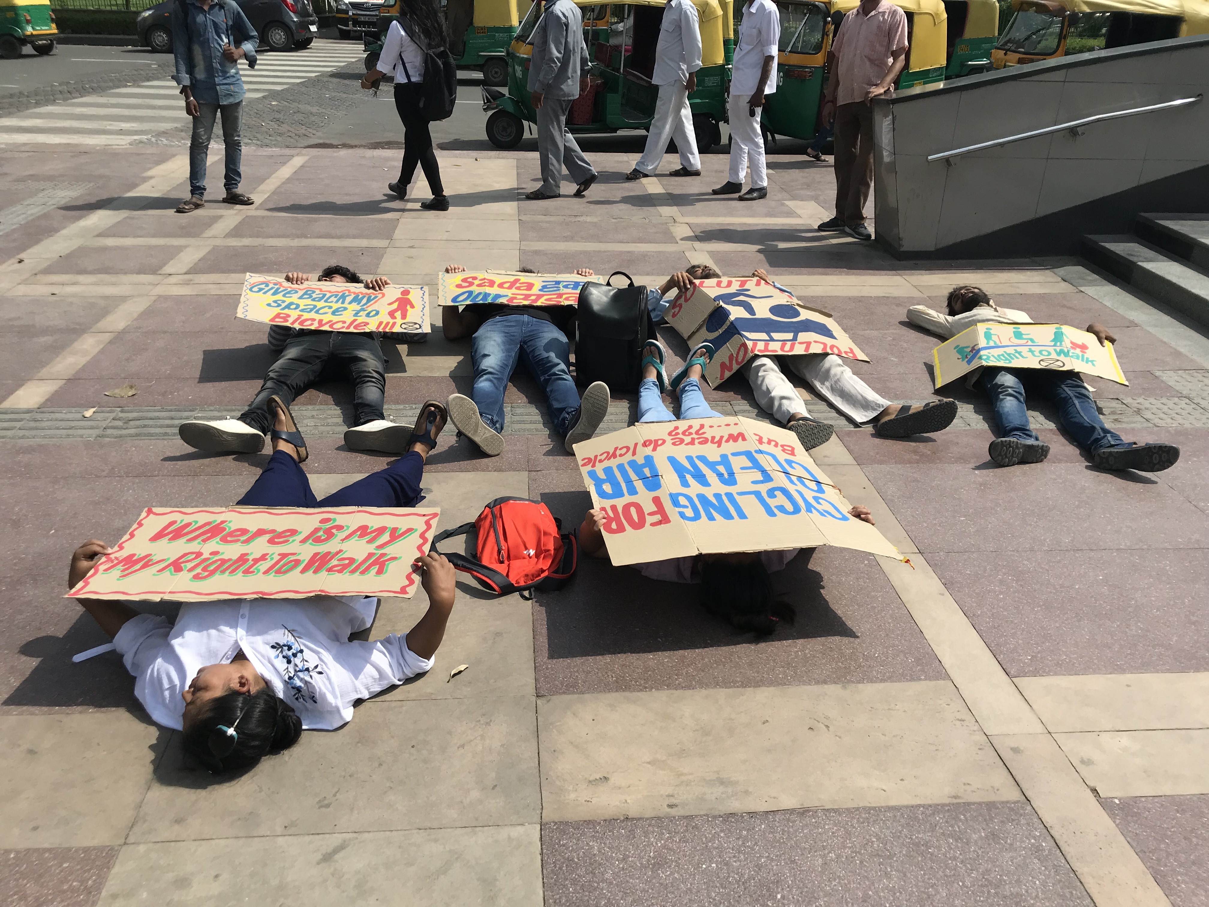Protestors lying on the road to demand a road to walk and cycle in Delhi. /CGTN Photo