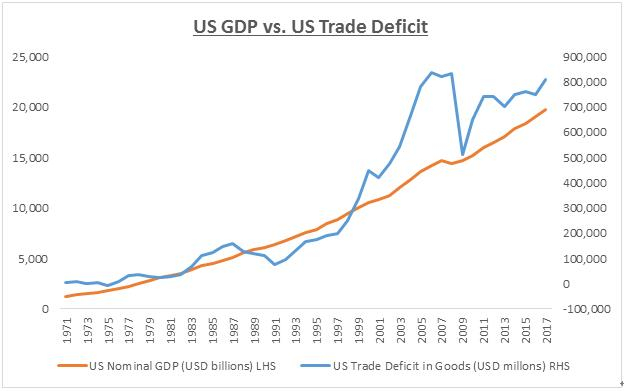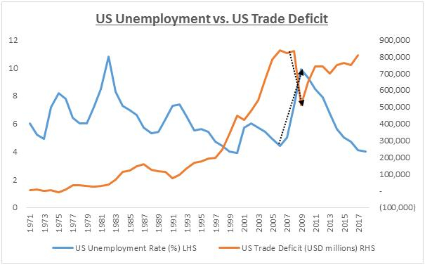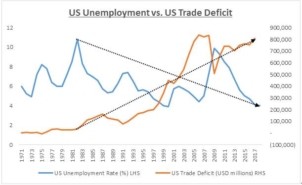 Figure 1 above shows the relationship between the US trade deficit and the unemployment rate since 1971. This is the earliest since the US began consistently running deficits with its major trading partners.
