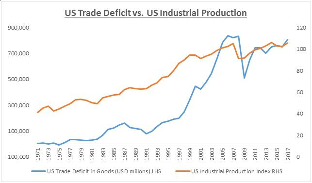 If as President Trump claims, a burgeoning trade deficit means everyone else is winning in trade at the expense of America then the US economy should not be so sturdy. Instead, the US is the world’s largest economy by nominal GDP and since 1971 US output has expanded in lockstep with its rising trade deficit (correlation = 0.95, Fig.2). US industrial production, a gauge of real output for American manufacturing also rose in tandem with the trade deficit (Fig.3). It’s further proof that global trade does not hollow out US manufacturing, but rather shifts its production to other goods, which the US has a comparative advantage in making.